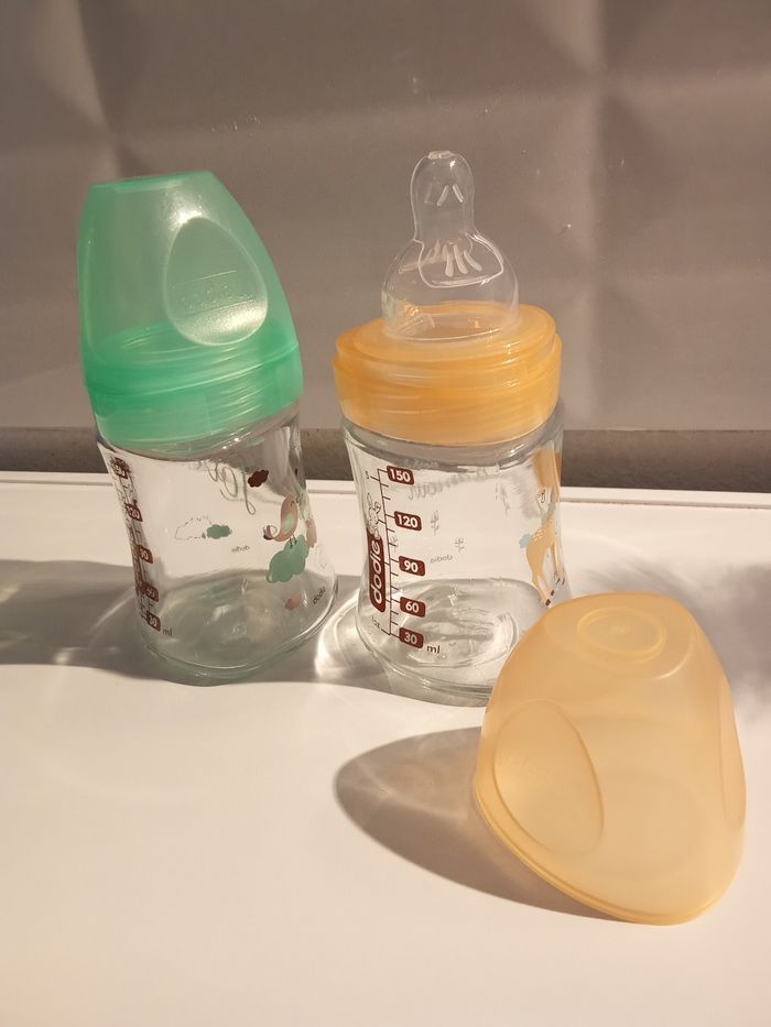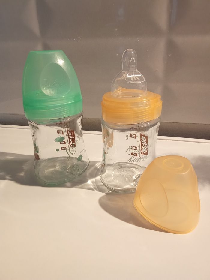 Lot de 2 biberons en verre, 150mL chacun. Marque Dodie. Le orange n'a jamais servi, et est fourni avec 1 tétine plate anti coliques (neuve). Le bleu a déjà servi, et est fourni sans tétine. Très bon état.