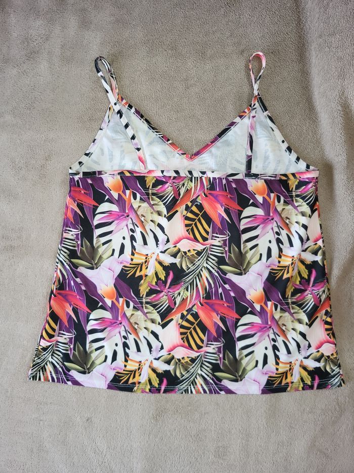Top léger fluide à fines bretelles Amisu taille M Motifs feuilles / fleurs multicolores Tons violet, rouge, vert... Mesures aisselle a aisselle 45cm Hauteur à partir des aisselles 37cm #virgy61tops