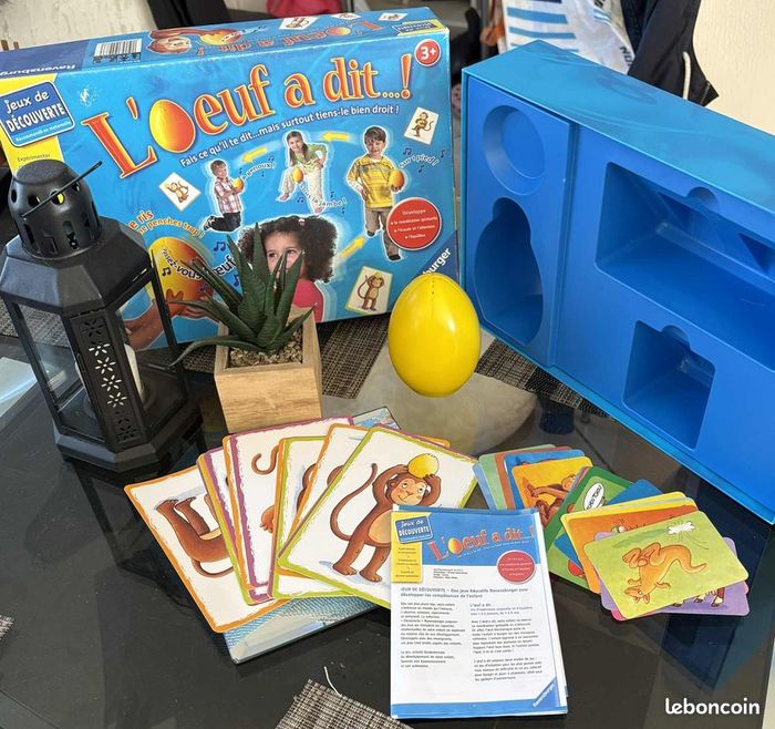 Jeu L'oeuf à dit Fais ce qu'il te dit... mais surtout tiens-le bien droit ! L'oeuf ritbsi tu le penches trop ! Jeu d'expression corporelle pour bouger et s'amuser, seul ou à plusieurs. 2 modes de jeu : un jeu d'adresse et de concentration : L'enfant observe les cartes et imite ce que fait le petit singe sans faire rire l'oeuf ! Un jeu collectif pour bouger et s'amuser à plusieurs. Les enfants se passent l'oeuf, en faisant habillement les positions énoncées sans le pencher sinon, c'est le gage ! a partir de 3 ans Ravensburger 15 euros