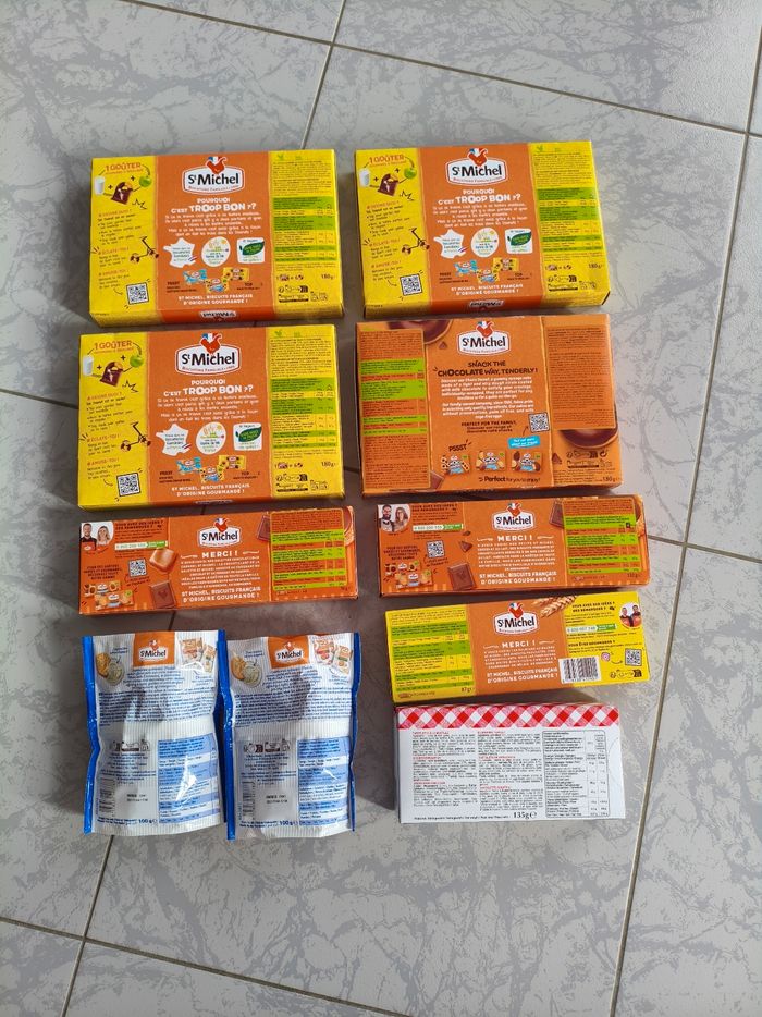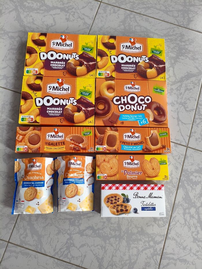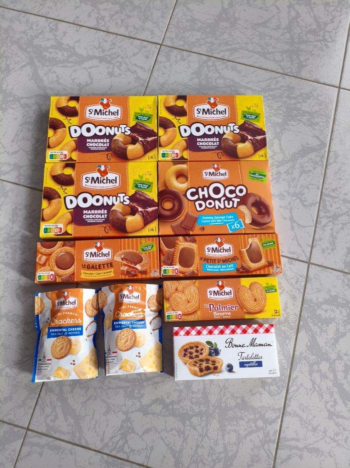 3 boîtes de doonuts marbrés chocolat + 1 boite choco donut +1 boite la galette chocolat coeur caramel+ 1 boite le petit saint Michel chocolat au lait+ 1 boite le palmier beurre + 1 boite Bonne maman tartelettes myrtilles + 2 sachets crackers emmental, neuves, jamais ouvertes.