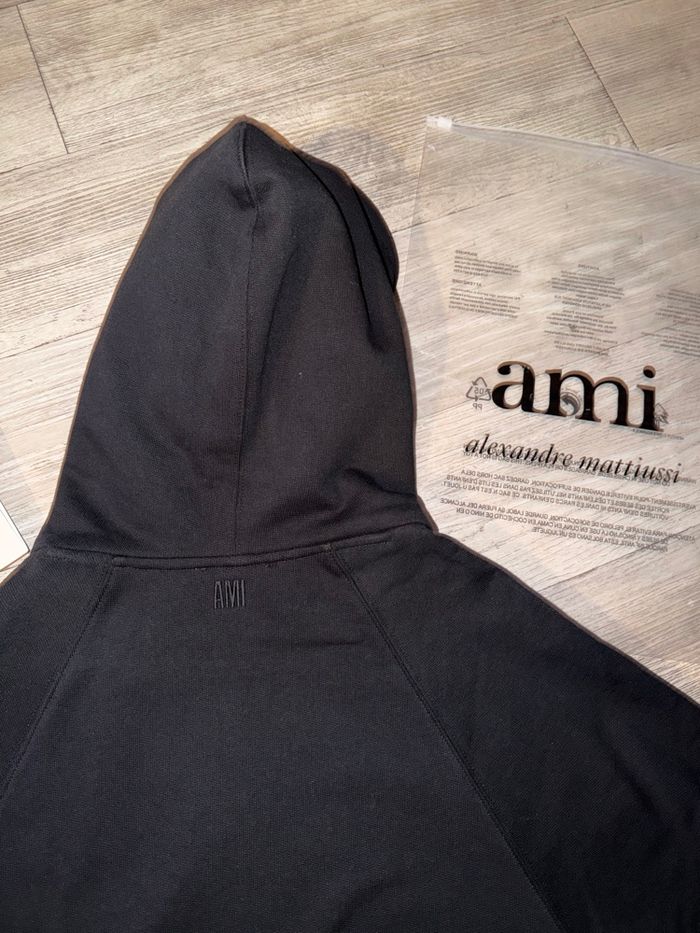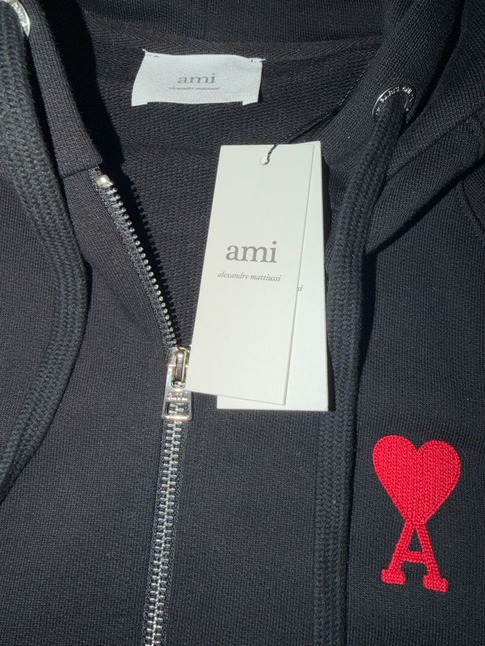 Magnifique sweat AMI Paris noir avec capuche et fermeture zippée, logo iconique cœur rouge brodé sur la poitrine. Coupe moderne, matière épaisse et confortable, très agréable à porter.
