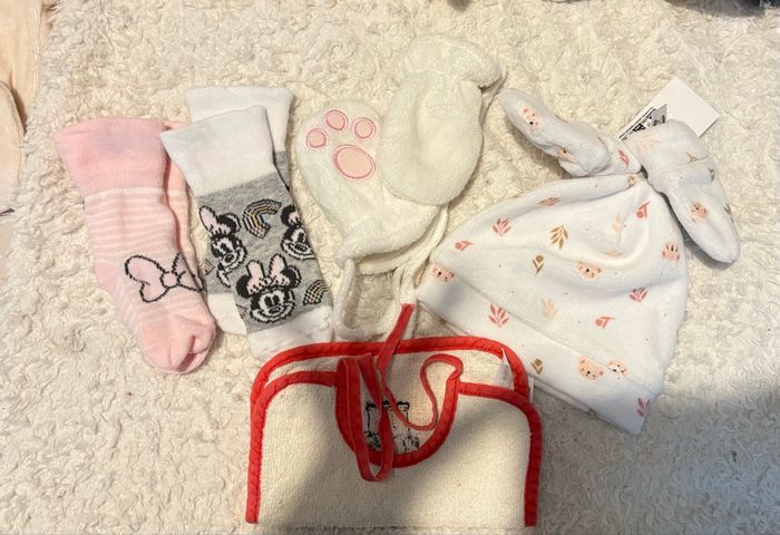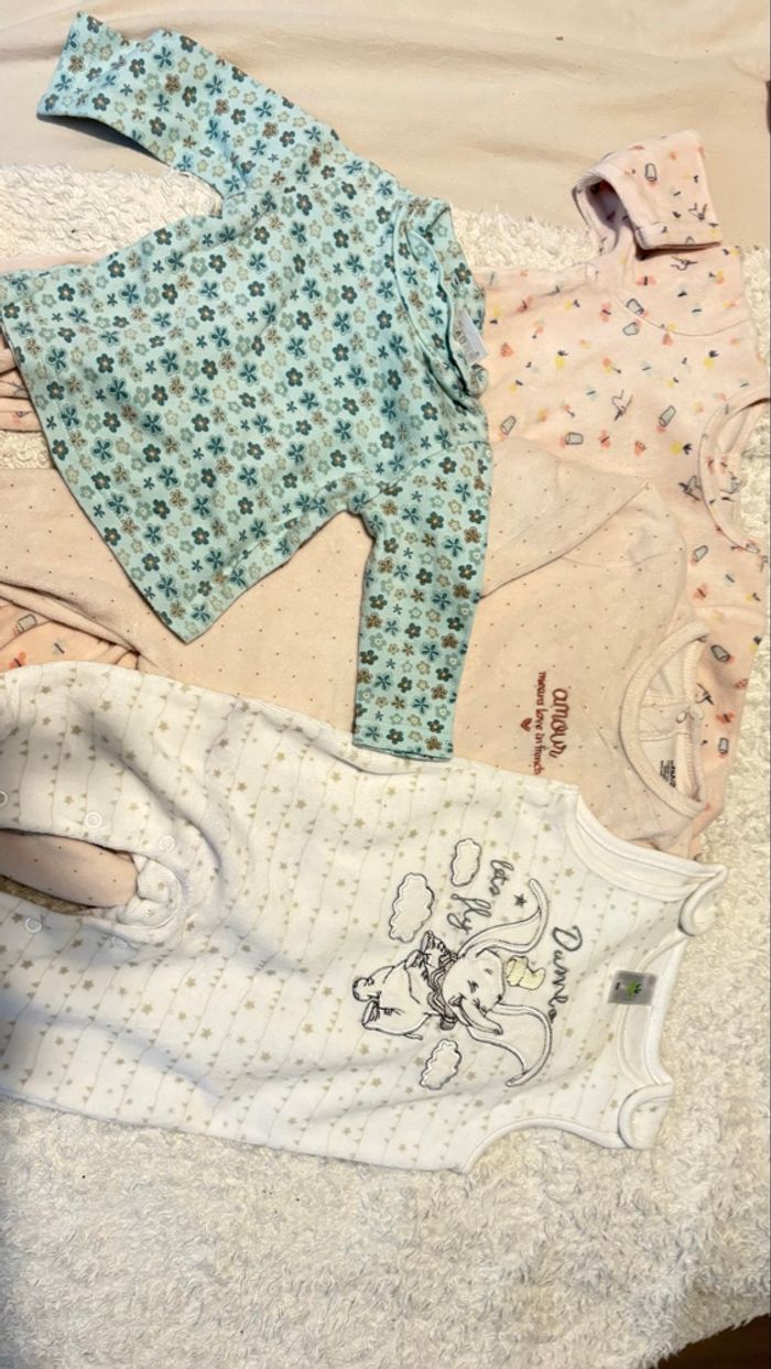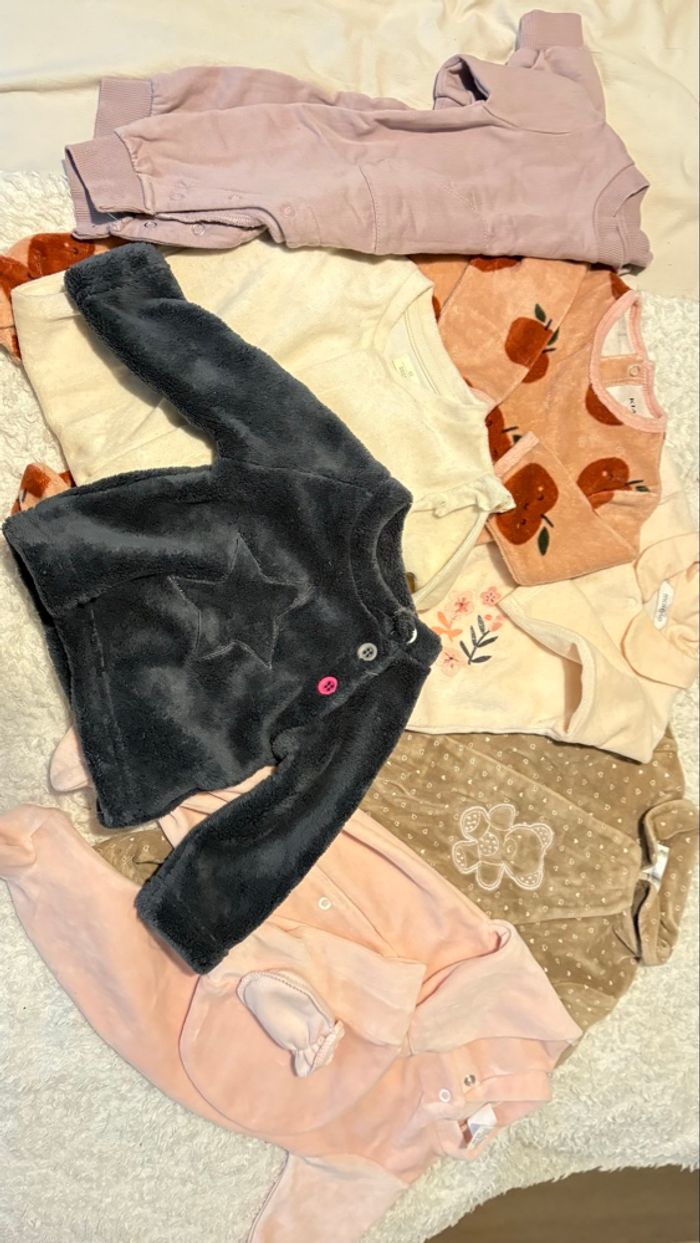 5 pyjamas 3 mois 1 combinaison 3 mois 1 pull chaud 3 mois 3 pyjamas 6 mois 1 haut 6 mois 2 bonnets/ 3 gants 2 chaussettes 1 bavoirs