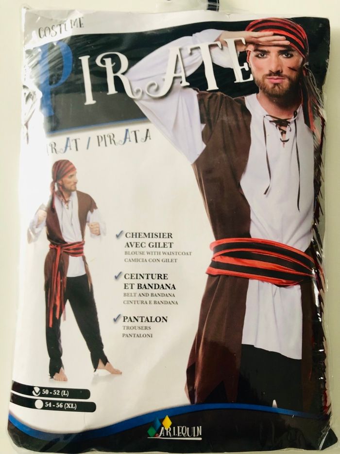 Je vends un déguisement de pirate, 5 pièces, pour homme, neuf. Taille L. Pantalon, chemisier avec gilet, ceinture et bandana.