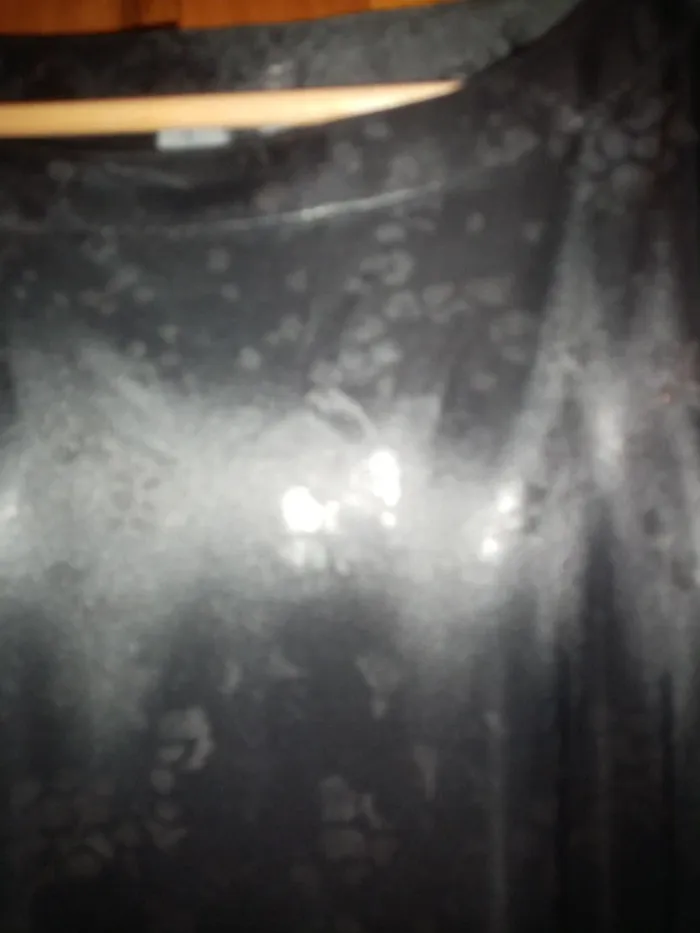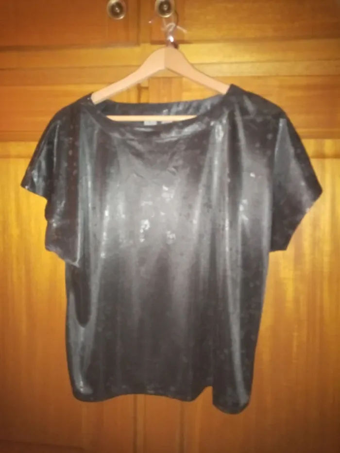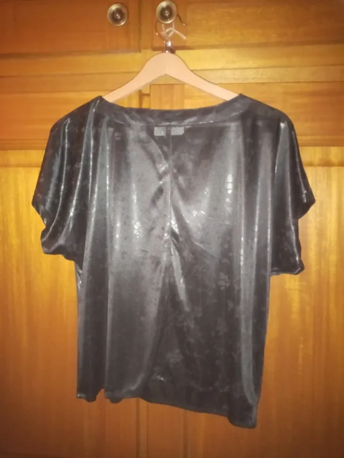 Top noir à motifs argentés, taille 40, manches courtes, 100% polyester. En très bon état sauf une petite trace d'étiquette en haut dans le dos.