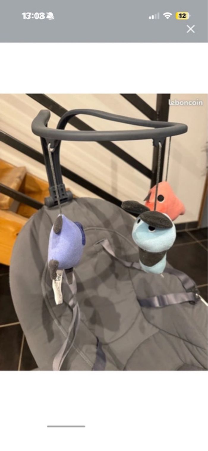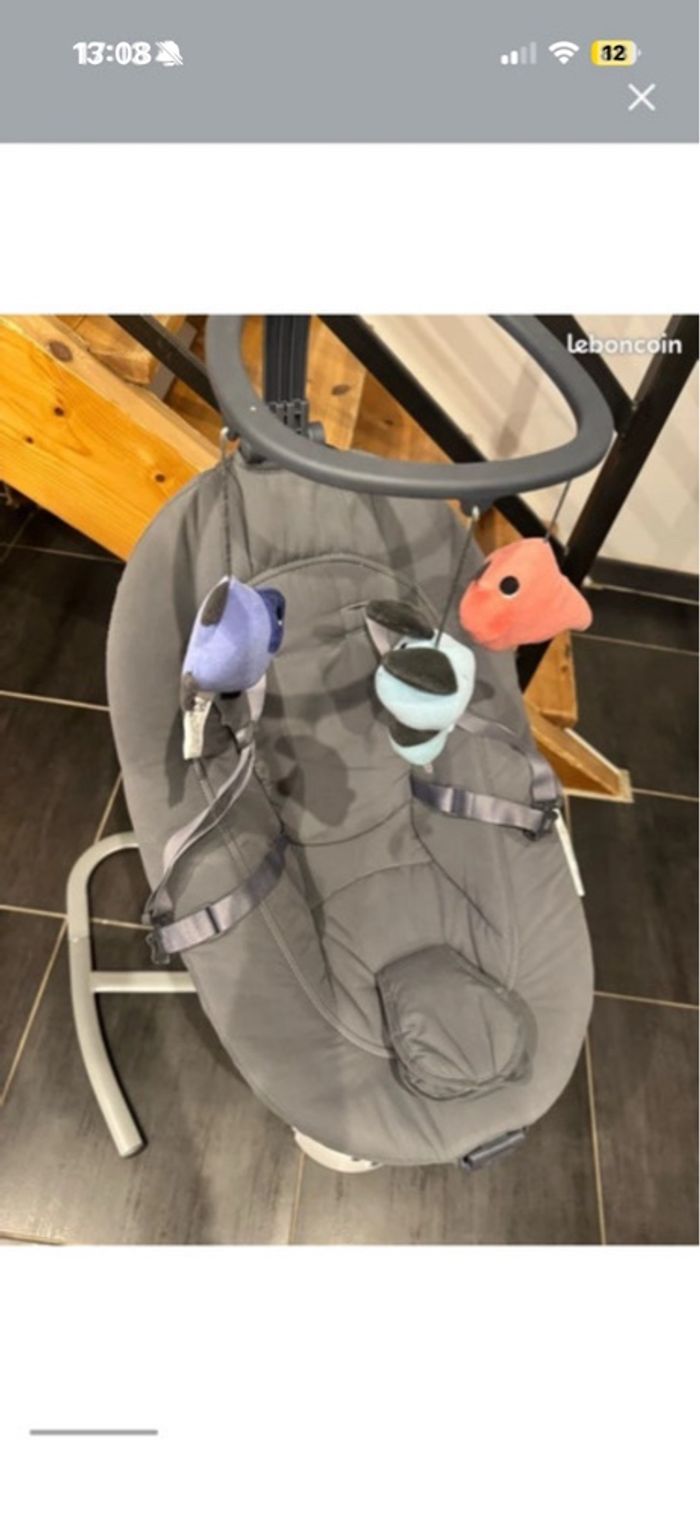 En très bon état Bébé la utiliser 2 mois même pas Fonctionne avec des piles La balancelle électrique idéale pour apaiser bébé avec ces 2 modes de bercement et son détecteur de mouvement. 2 modes de bercement : d'avant-arrière ou latéral. Mode transat fixe. Détecteur de mouvement pour déclencher le bercement aux mouvements de réveil de bébé. La balancelle complète : 5 vitesses de bercement, programmation (10, 20 ou 30 minutes), 3 positions d'assises pour chaque moment de la journée de bébé, assise rotative à 360, 8 mélodies. Dès la naissance et jusqu'à 9kg : Coussin réducteur pour nouveau-né intégré amovible. Confortable : Véritable nid douillet grâce à ses matières toutes douces. Sécurisé : Harnais 5 points pour maintenir bébé en toute sécurité dans sa balancelle electrique. Dimensions de l'assise : l81 x L65 x H79 cm Empâtement au sol : L82 x P63 cm Poids 8kilos80 Laver avant envoi.