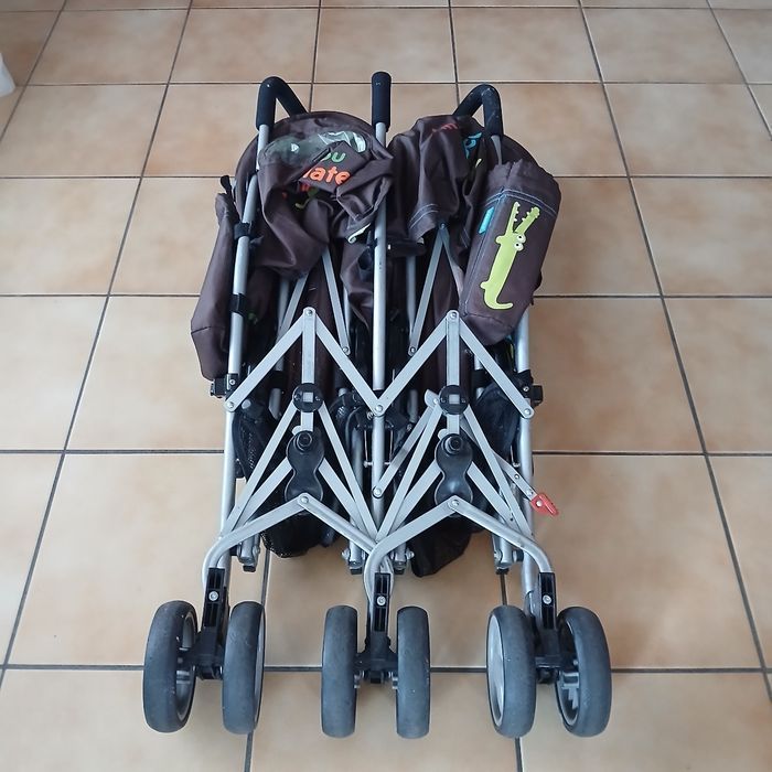 Vends Poussette double marque COSATTO You 2 en très bon état (jumeaux ou enfants rapprochés) NEGIOCIABLE 1réducteur pour naissance,chancelières individuelles (interieur polaire) - pliable (105 cm) 65cm de large - sièges indépendants - Capots individuels - doubles roues pour stabilité - porte bouteilles ou biberons et poches côté individuels - paniers doubles petites tâches sous les capots; freins en bas Remise en main propre à Léguevin 31490 sud ouest