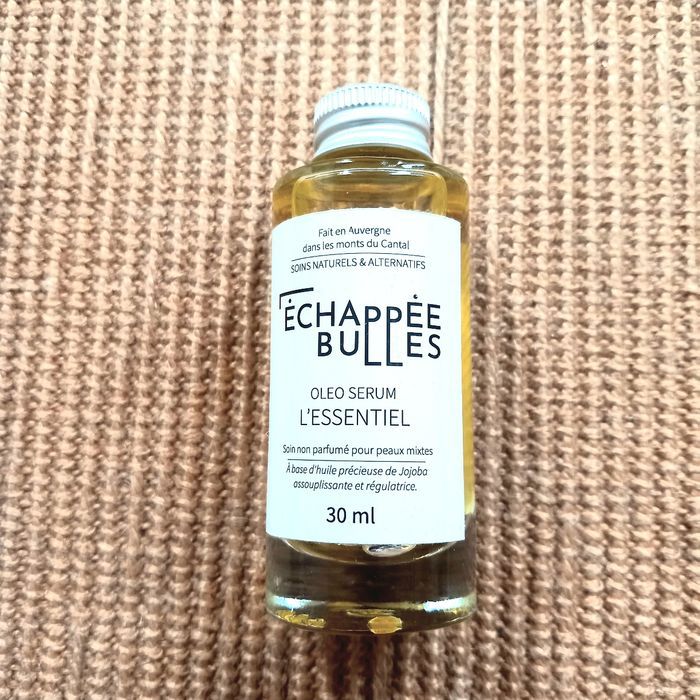 Oléo-Sérum L'essentiel (30ml) BIO et Artisanal ECHAPPEE BULLES (Cantal, France) Corps et Visage Non parfumé Huile toute douce à base d'huile de jojoba, avec un mélange d'huiles précieuses : d'argan, de noisette, d'avocat. Ingrédients : Huile de jojoba, Huile d’argan, Huile d’avocat, Huile de noisette, Huile de tournesol, Vitamine E NEUF!! 2 flacons disponibles