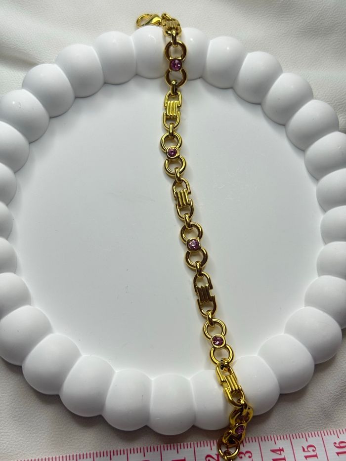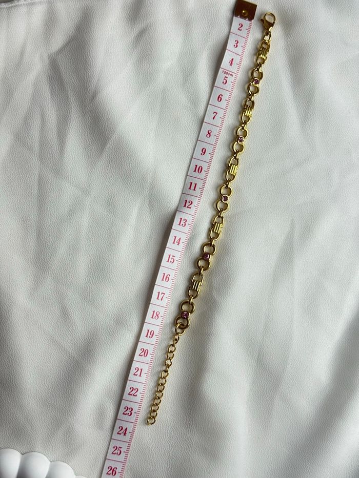 Ajoutez une touche d'élégance vintage et colorée à votre poignet avec ce bracelet raffiné. Conçu pour durer, il allie la robustesse de l'acier inoxydable à la finesse de cristaux étincelants. • Matériau de Haute Qualité : Fabriqué en acier inoxydable (finition dorée), résistant à l'eau, à la corrosion et conçu pour ne pas ternir avec le temps. • Design Unique : Une alternance élégante de maillons circulaires sertis de cristaux roses et de maillons rectangulaires texturés pour un relief sophistiqué. • Ajustement Parfait : Équipé d'une chaînette d'extension pratique et d'un fermoir mousqueton sécurisé pour s'adapter à toutes les tailles de poignet. • Dimensions : Longueur totale d'environ 23 cm (chaîne de réglage incluse), permettant un porté ajusté ou plus lâche selon vos préférences. Idéal pour : Un cadeau attentionné ou pour sublimer vos tenues quotidiennes avec une note de couleur délicate jamais porté état neuf • Hypoallergénique : Convient aux peaux sensibles. • Style : Chic, intemporel et moderne. • Entretien : Très facile, un simple chiffon doux suffit à raviver son éclat.