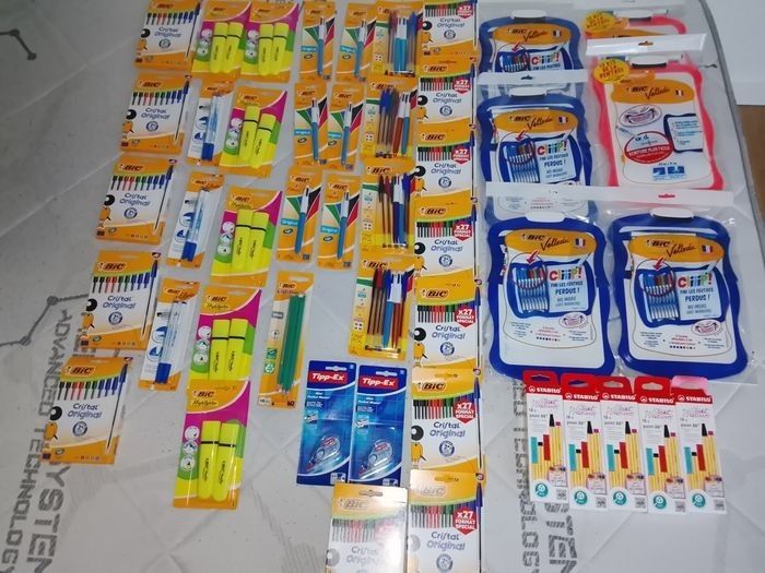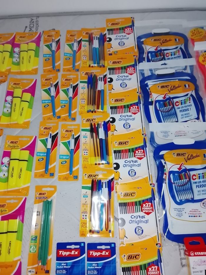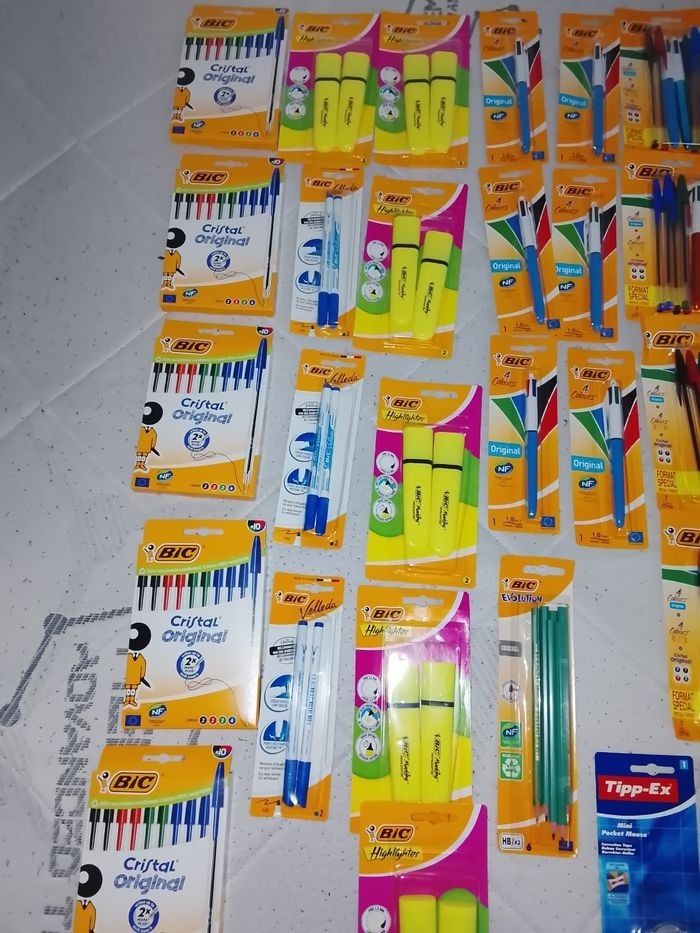 stylo bic X10 = 1.50€ - 2 surligneur jaune bic = 1.20€ - 2 feutre velleda bic = 1€ - 1 stylo 4 couleurs bic = 1.20€ - 6 crayon à papier bic = 1.10€ - 1 correcteur tipp-ex = 1€ - 2 bic 4 couleurs+ 5 Bic normal = 2.40€ - ardoises velleda bic + 5 feutres = 2.40€ - ardoises velleda clipps = 2.70€ - stylo bic crystal X27 = 2.10€ - 18 Stylos-feutres stabilo = 6.50€