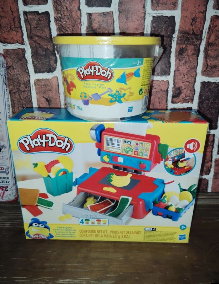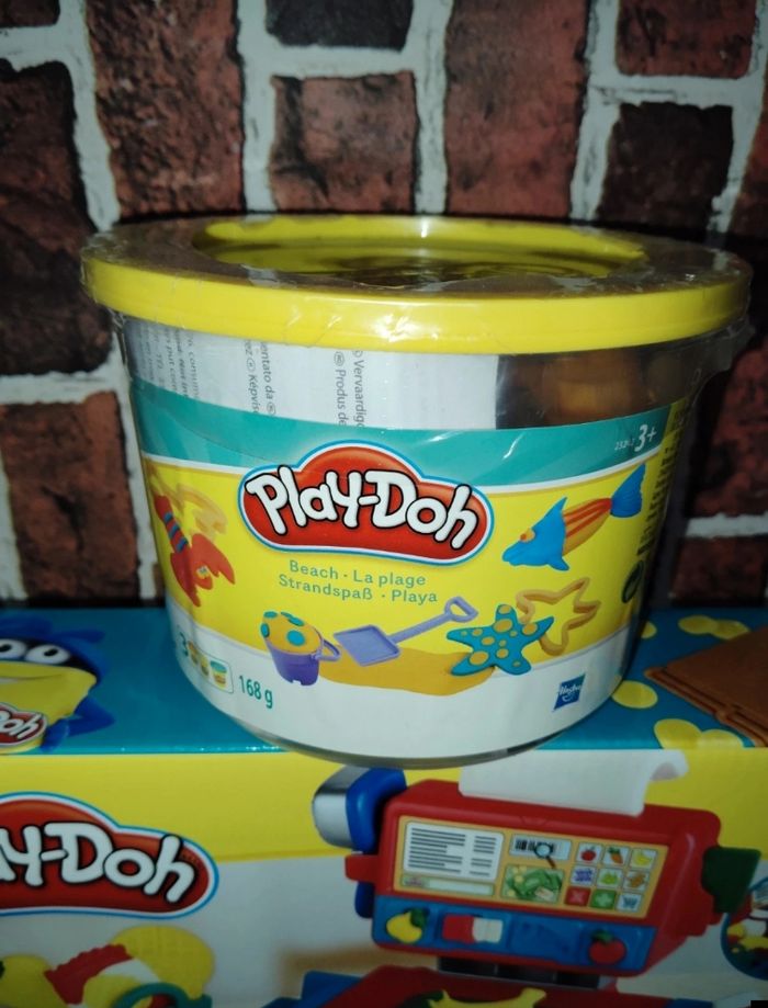 Lot pâte à modeler Play-Doh caisse enregistreuse et seau thème plage.