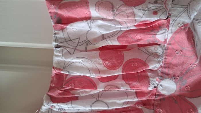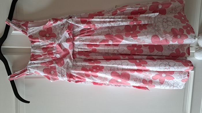 Très jolie robe d'été, un peu longue excellent état doublée Petits plis bretelles larges ceinture et nœuds dans le dos Marque vinyl fraises