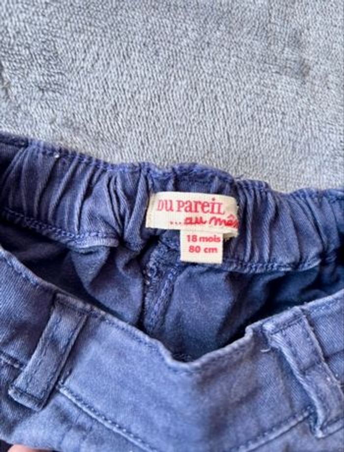 Vends lot de 4 pantalons fille taille 18 mois, en très bon état. Le lot comprend : • Jegging Gémo couleur bordeaux, matière souple et confortable, taille élastiquée • Jean Vertbaudet bleu clair, avec jolis empiècements cœur aux genoux, coupe confortable • Pantalon Du Pareil au Même bleu marine, matière douce, coupe droite • Pantalon Kiabi gris, léger motif discret, taille élastiquée avec lien décoratif Vêtements propres, sans taches ni trous, peu portés. Envoi rapide et soigné N’hésitez pas à regarder le dressing ☺️ ‼️Photo et vidéo de l’emballage avant envoi‼️