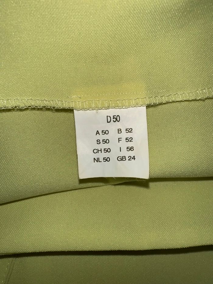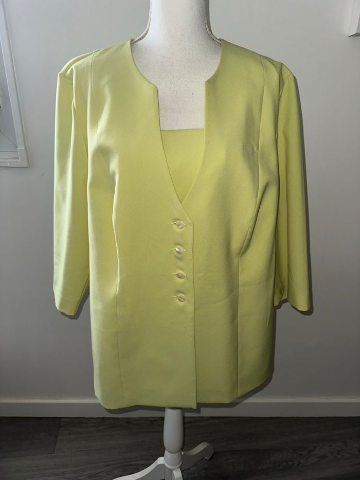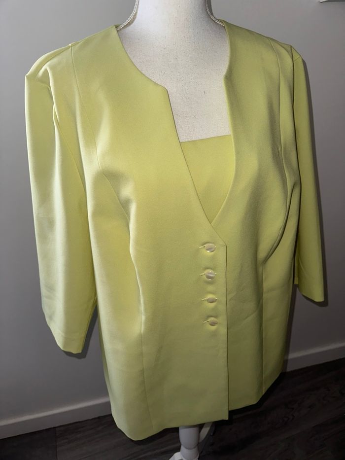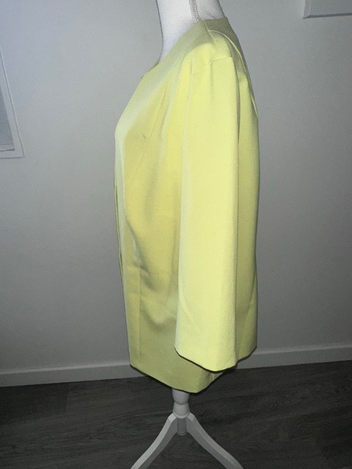 Blazer - Excellent état - Taille 52 équivalent 6XL Dimensions en bas de l’annonce - Couleur jaune vert anis identique aux photos - Se ferme avec des boutons - Décolleté ajustable avec une empiècement à laisser ou à retirer - Doublure intérieure - Vintage, années 80’ - Manches 3/4 - Polyester et acétate Dimensions: - 47cm niveau épaules - 60cm niveau aisselles - 72cm de long
