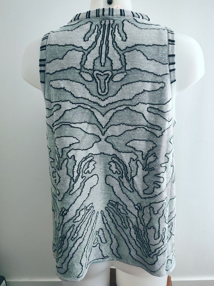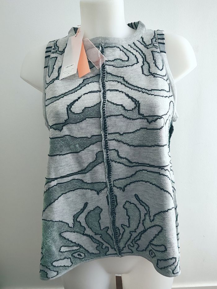 Pull neuf avec étiquette sans manches, Mesure à plat largeur sous aisselles 50 longueur dos 55 motif abstrait élégant, dans des tons gris avec du fil métallique argenté et vert d’eau très doux et modernes. Coupe fluide et confortable, intérieur en voile vert, idéale pour une tenue chic décontractée ou habillée selon les associations. 👗 Idées de look : À porter avec un jean noir, un pantalon clair ou une jupe pour un style moderne et féminin.