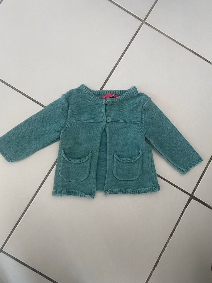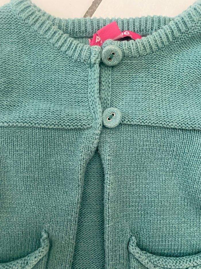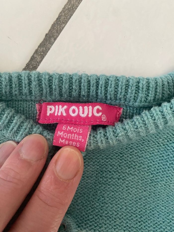 Gilet fille vert assez épais Un peu décoloré mais en très bon état Taille 6 mois Marque Pik ouic
