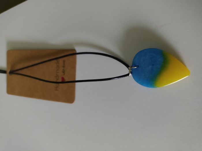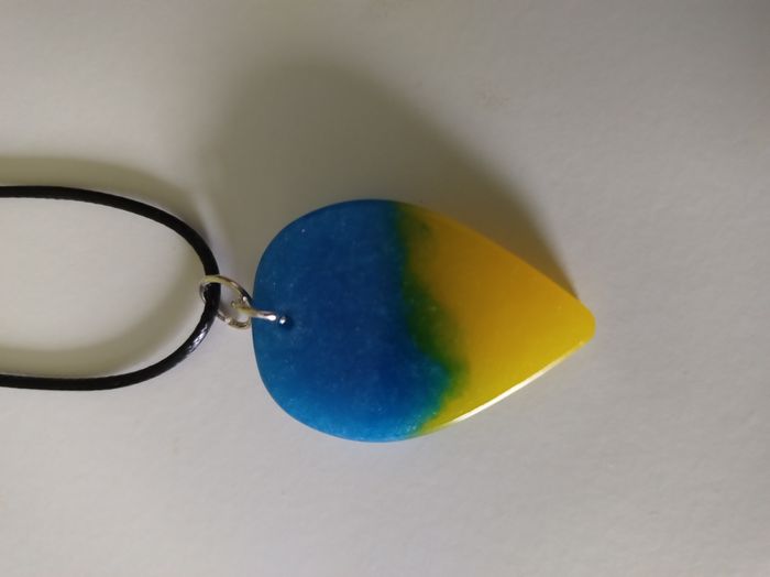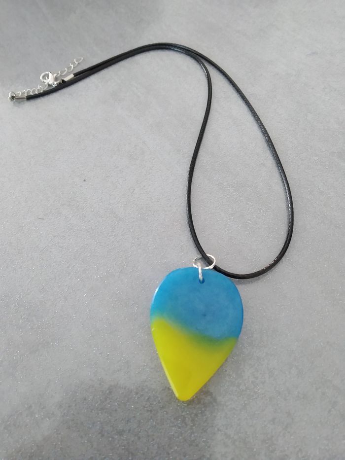 Pendentif en résine époxy multicolore jaune et bleu longueur : 4 cm largeur: largeur : 2.5 cm Ce pendentif léger à porter est fait main, il peut donc y avoir quelques imperfections, cela leur rend unique. Peut être porté par une femme, un homme, adolescent/te. L'envoi se fait sous lettre suivie à bulles. Ni repris, ni échangé.