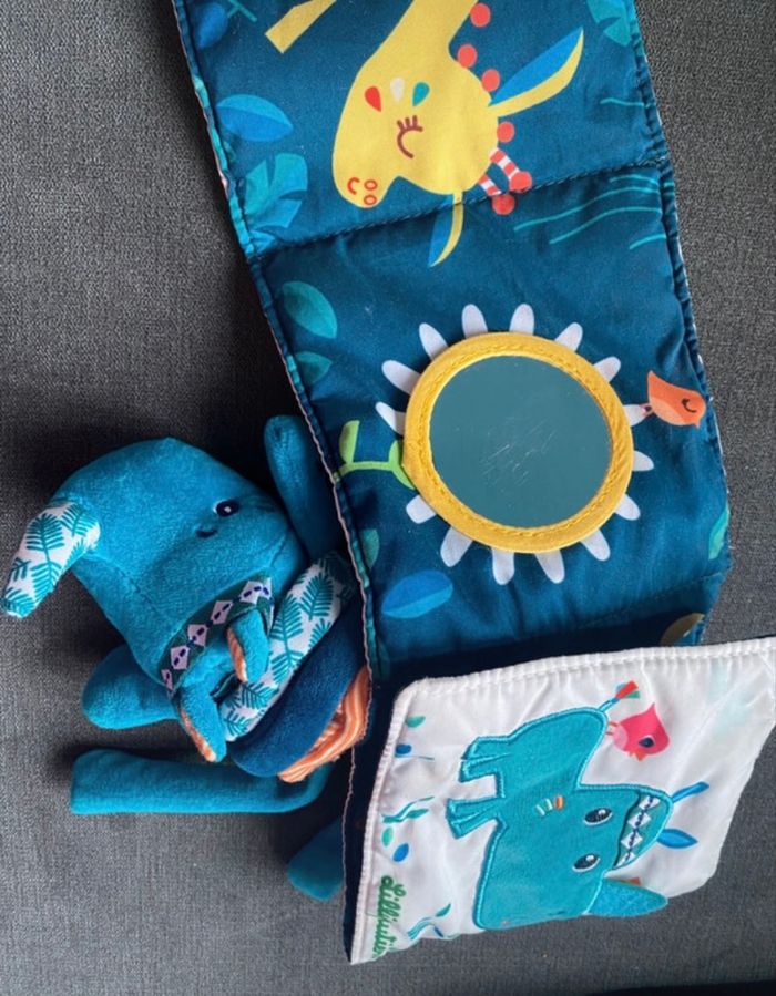Deux jouets lilliputiens Un livre en tissu et un rhinocéros qui vibre