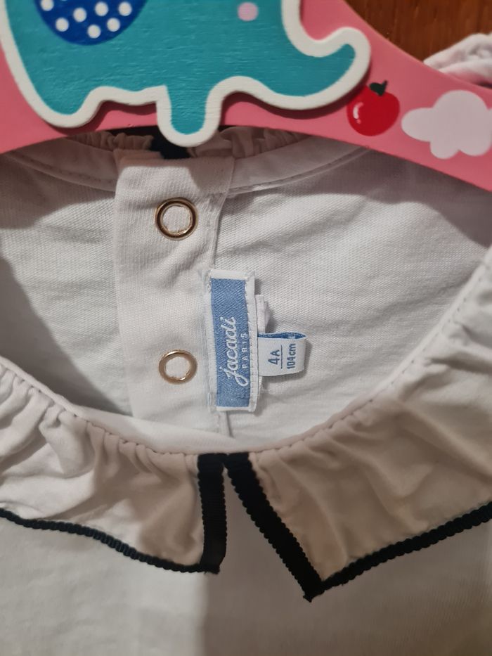 T-shirt manches longues blanc avec col liseré bleu marine. En taille 4 ans de la marque Jacadi.