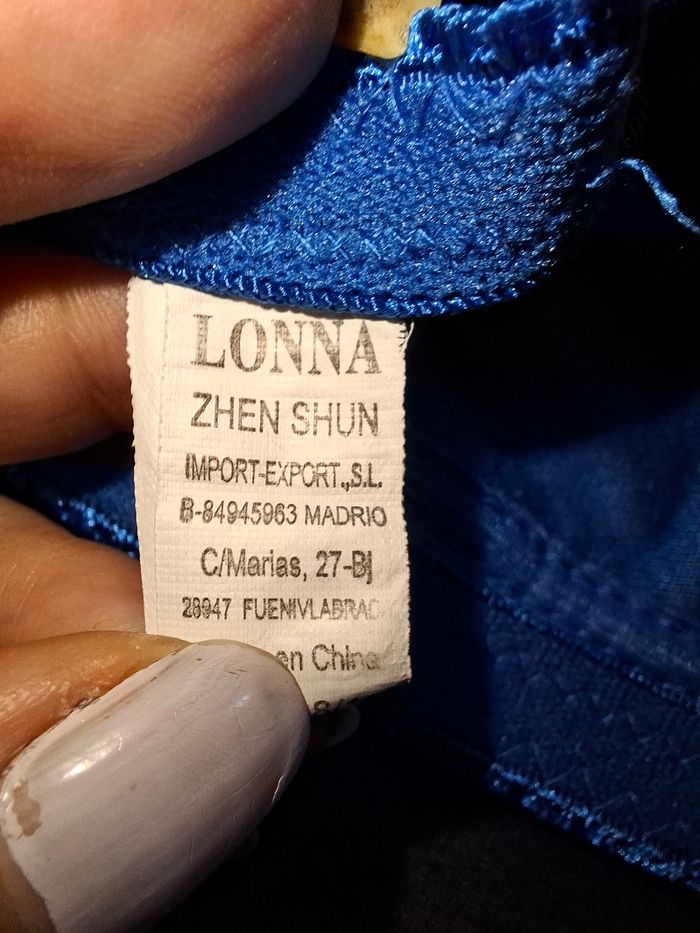 À vendre, magnifique soutien-gorge de la marque Lonna Zhen Shun. Un modèle au style rétro avec un fini satiné bleu brillant très élégant et des détails en dentelle délicate sur les bonnets. ​Type : Soutien-gorge sans armatures pour un confort optimal tout au long de la journée. ​Détails : Petit nœud décoratif à l'entre-sein, bretelles réglables et fermeture par triple agrafe au dos (3 niveaux de réglage). ​Composition : Mélange confortable de 60,3% Coton, 28,5% Viscose et 11,2% Élasthanne (Spandex). ​État : Très bon état général. ​Origine : Importé d'Espagne. ​Taille : * Étiquette : 48 (Taille espagnole) / 110 (Taille française). ​Bonnet : Non spécifié sur l'étiquette, mais estimé à un Bonnet D au vu de la profondeur et de la coupe.