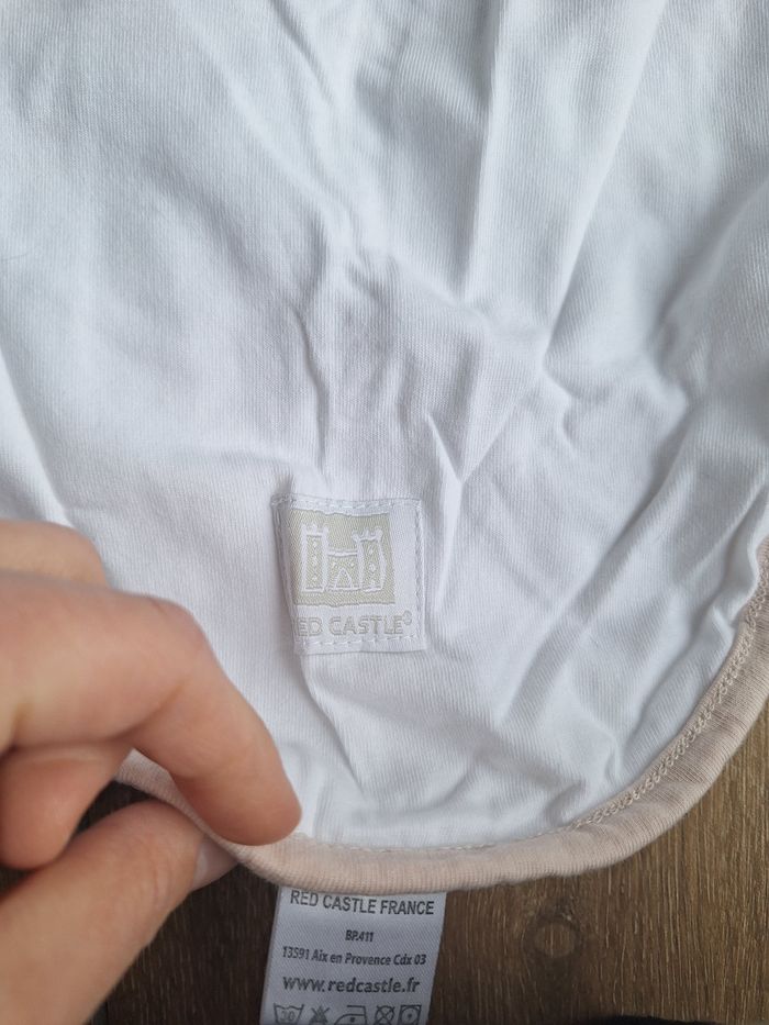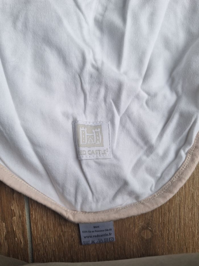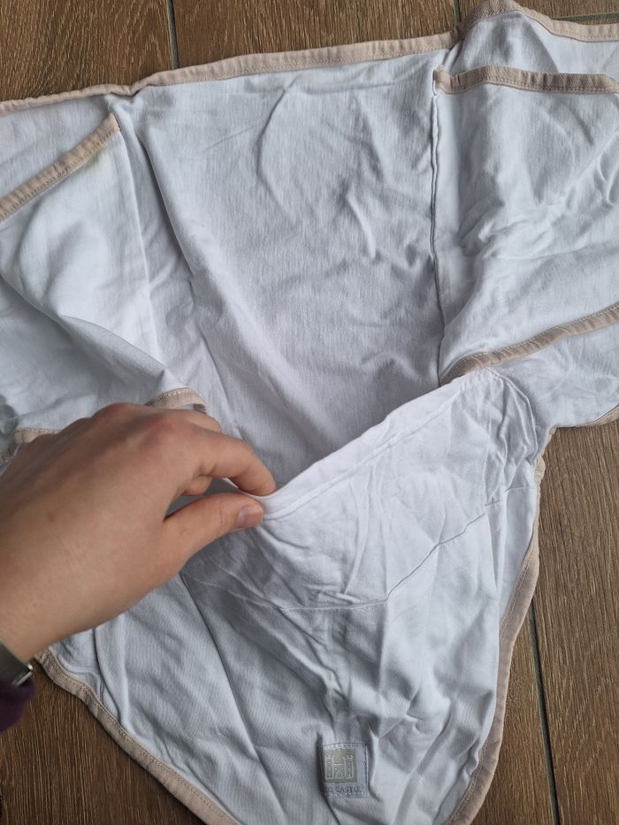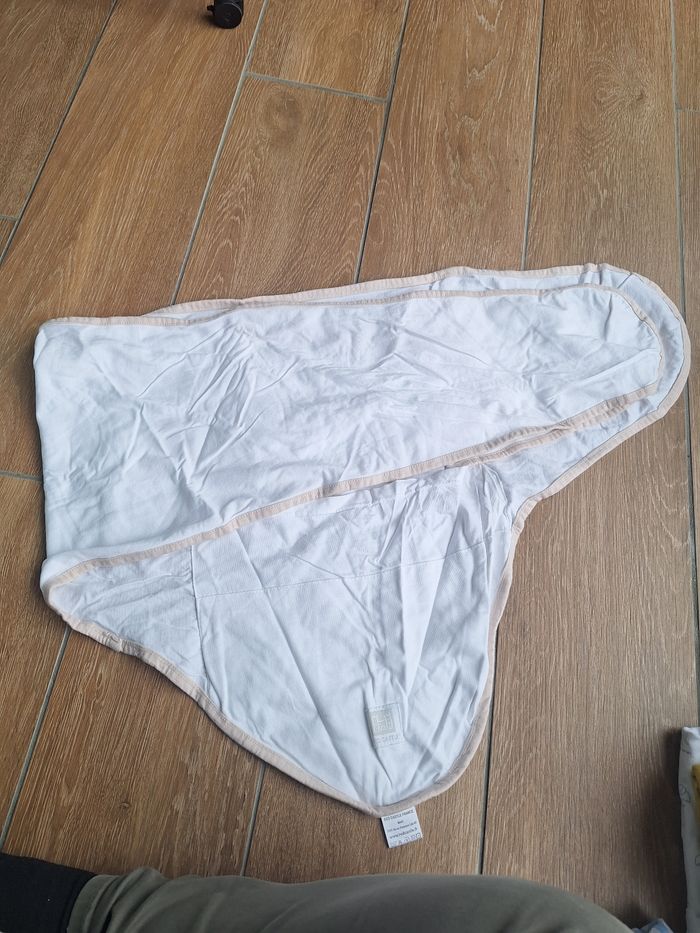 Couverture d'emmaillotage pour bébé, en coton, facile à utiliser (voir notice en photo), pour contenir et rassurer bébé dans ses 1ers jours/mois (à ne pas utiliser au delà de 3-4 mois ou quand bébé arrive à se retourner), rappelle vaguement le ventre ou les bras de maman. Coloris neutre : blanc et bordures beiges. Peu utilisé donc en très bon état. En photo il est très froissé mais je l'ai relavé et bien plié entre temps.