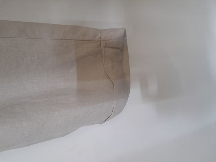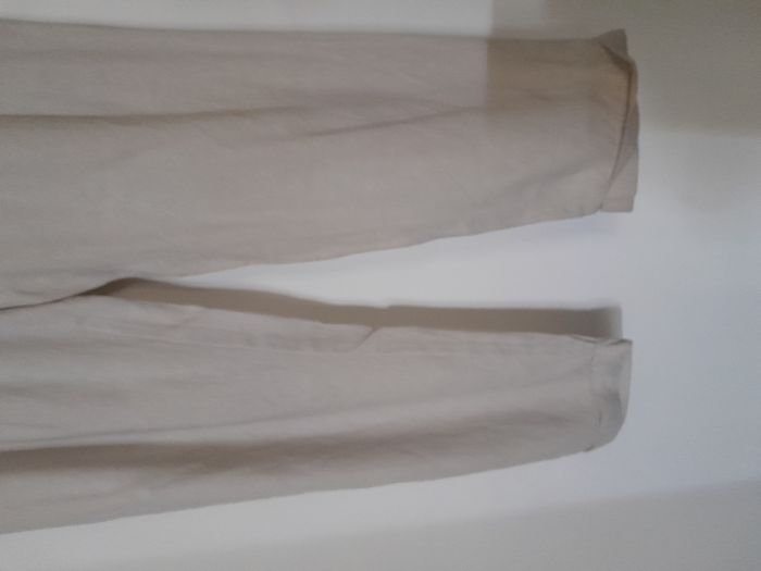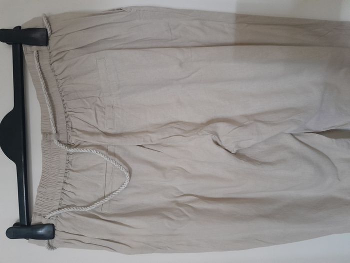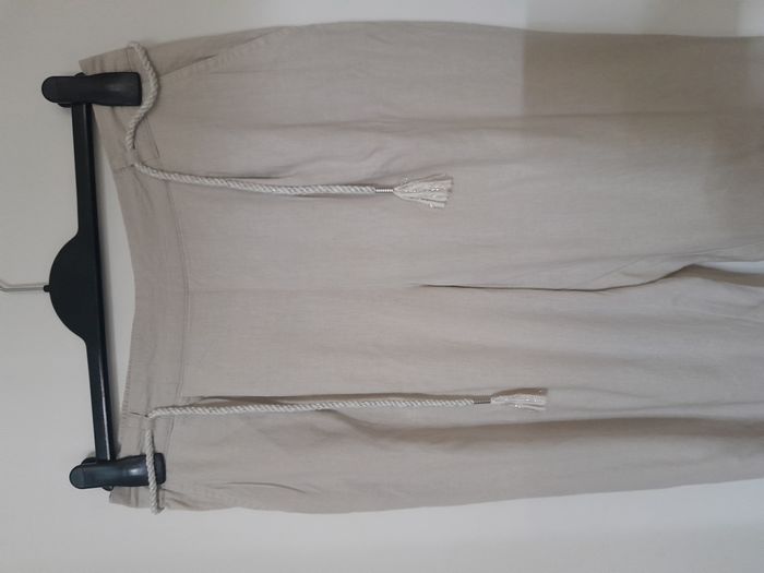 Pantalon, 2 poche, revers sur le bas, élastique à la taille + cordon Longueur : 97cm Taille en cm : 38 Matière : 52 % Lin, 48 % Viscose Marque : Cache Cache