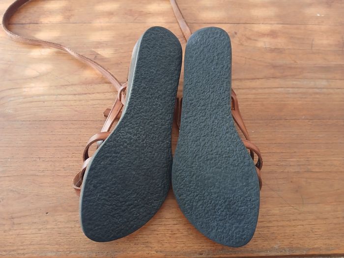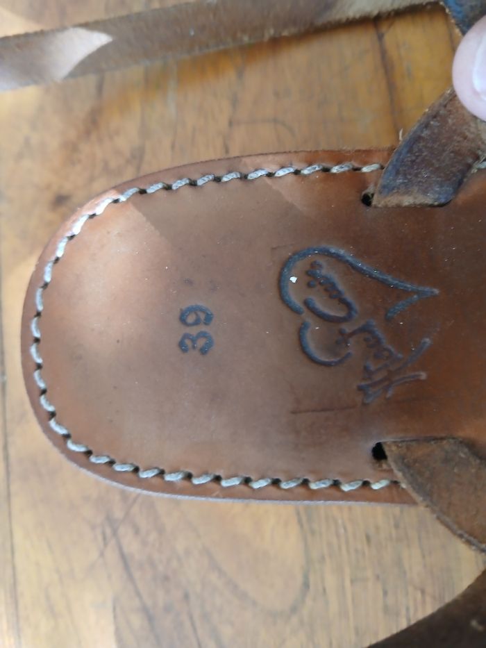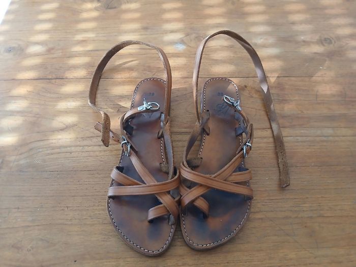 Sandales en cuir avec petits talons (3 cm) Boucle assez longue pour pouvoir faire un tour sur la cheville. Pointure 39. Très bon état