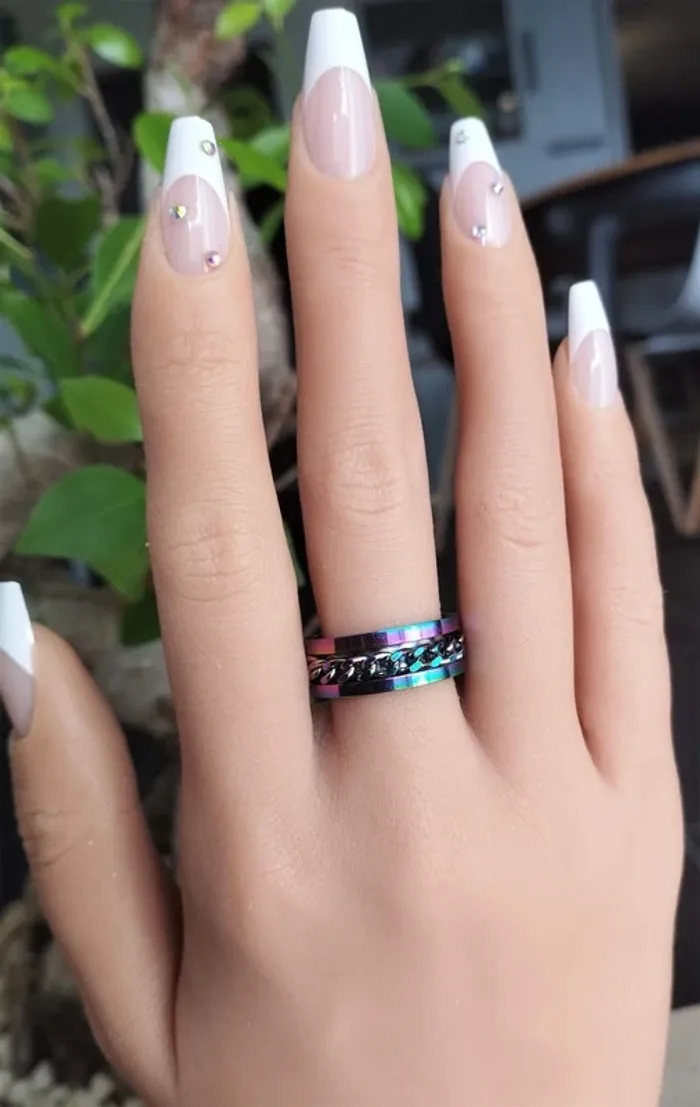 Bague acier multicolore avec chaine. Taille 19 mm.