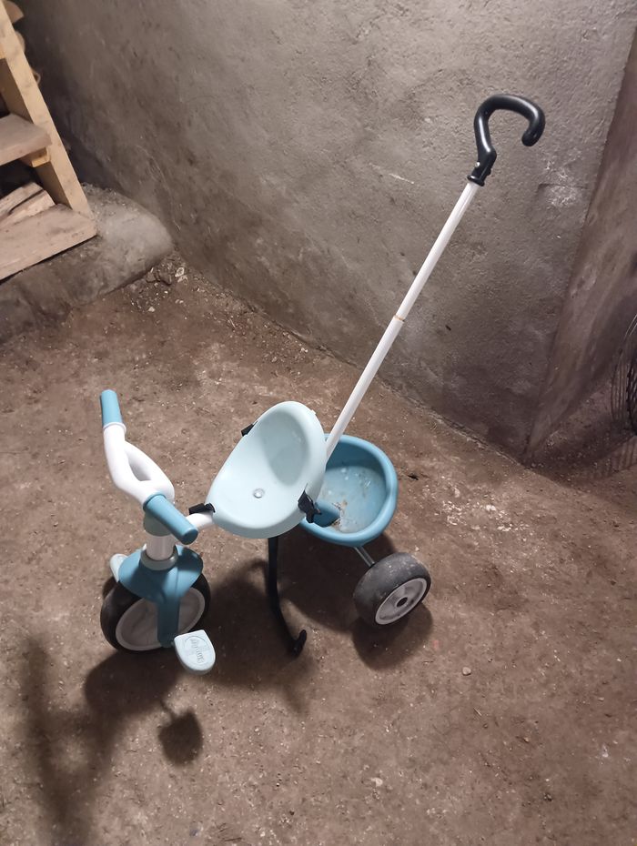 Tricycle Smoby en bon état pour enfant de 0 à 3ans. La perche pour diriger l'enfant peut se retirer quand l'enfant grandit. Les pédales peuvent être en roue libre ou non.