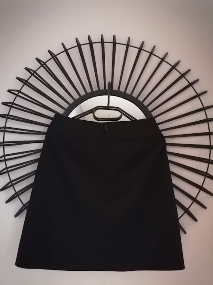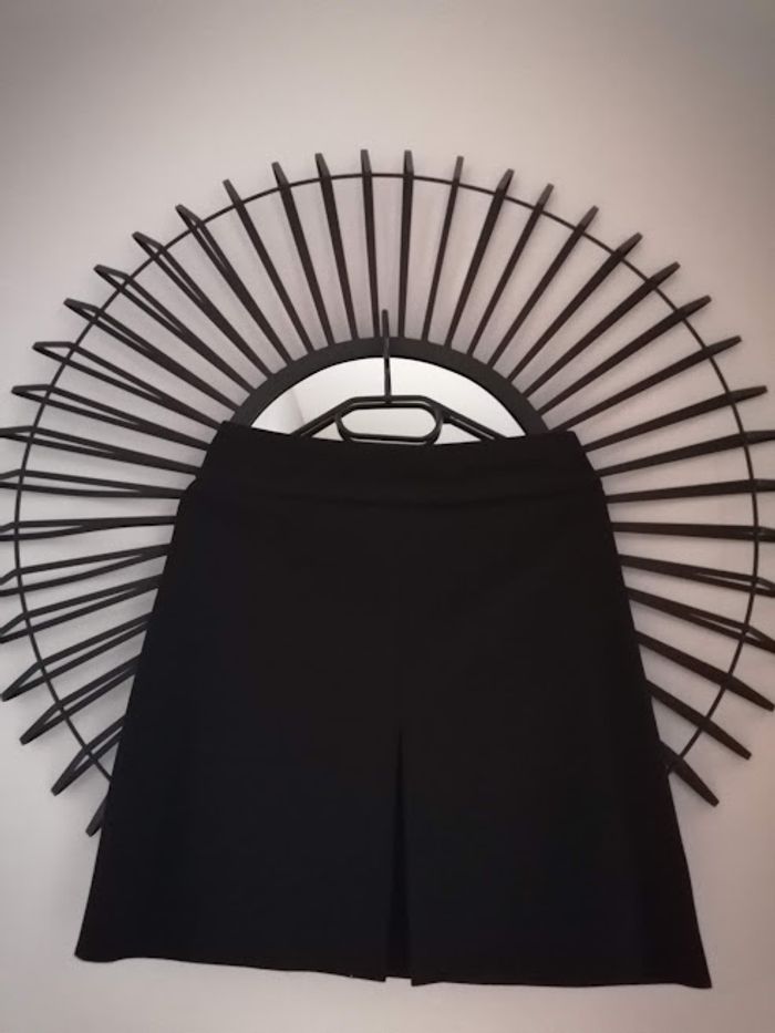 Jupe courte doublée 1 pli sur le devant Forme trapèze Longueur 45 cm Taille 36 Coloris marron foncé 62% polyester 33% viscose 5% elasthane Très bon état