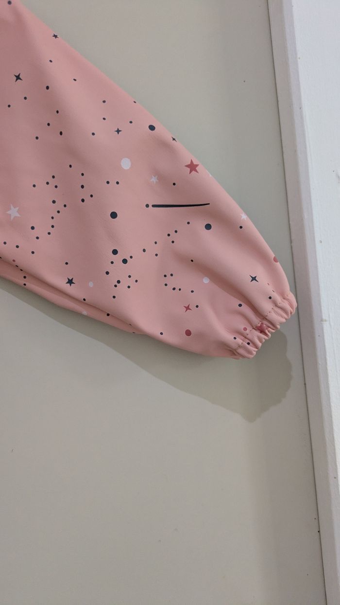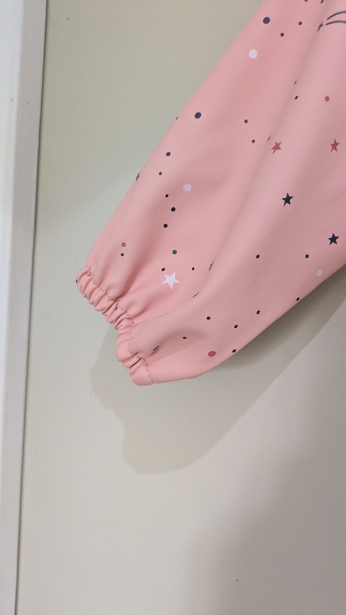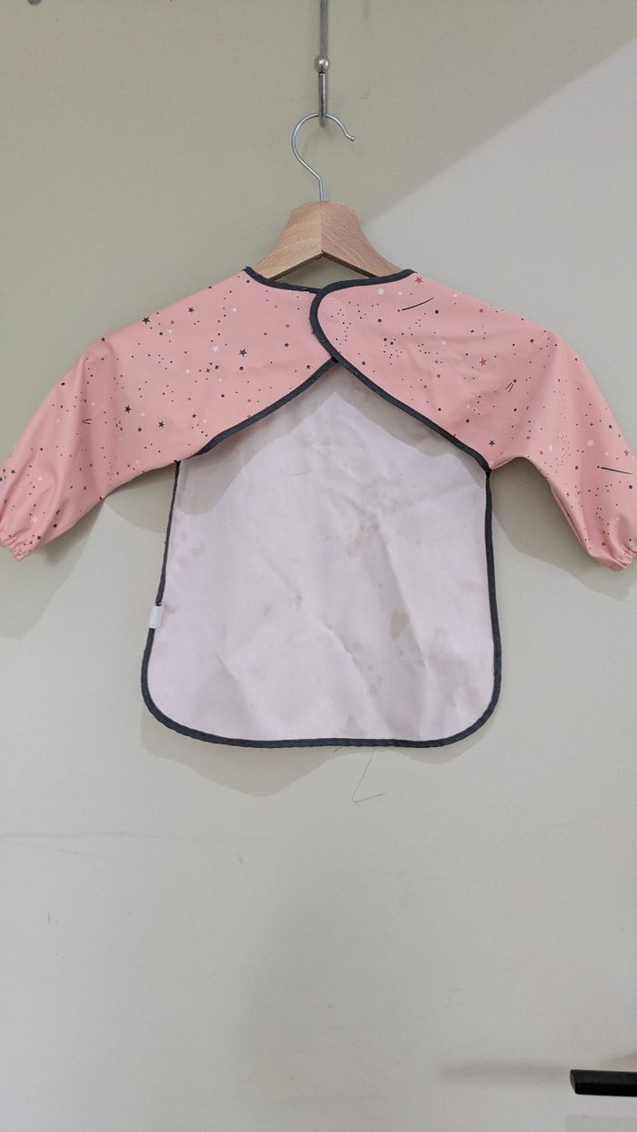 Idéal pour les repas ou les activités créatives (peinture, pâte à modeler), ce bavoir à manches longues protégera parfaitement les vêtements de votre enfant ! ✨ Motif : Adorable imprimé Simba et Nala (Le Roi Lion) sur un fond rose avec des petites étoiles 🌟. Pratique : Matière imperméable facile à nettoyer d'un coup d'éponge 🧽. Confort : Poignets élastiques pour un bon maintien et fermeture par scratch au dos. État : Très bon état, peu servi ✅. Fini les taches sur les jolis pulls ! 🙅‍♀️ 📦 Envoi rapide garanti.