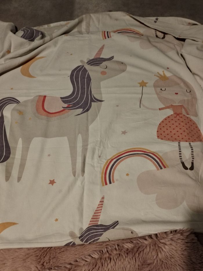 Parure de lit 1 personne avec housse de couette et taie d'oreiller. Fond blanc et divers dessins : fée, licorne etc.. Boutons pour fermer la housse de couette.