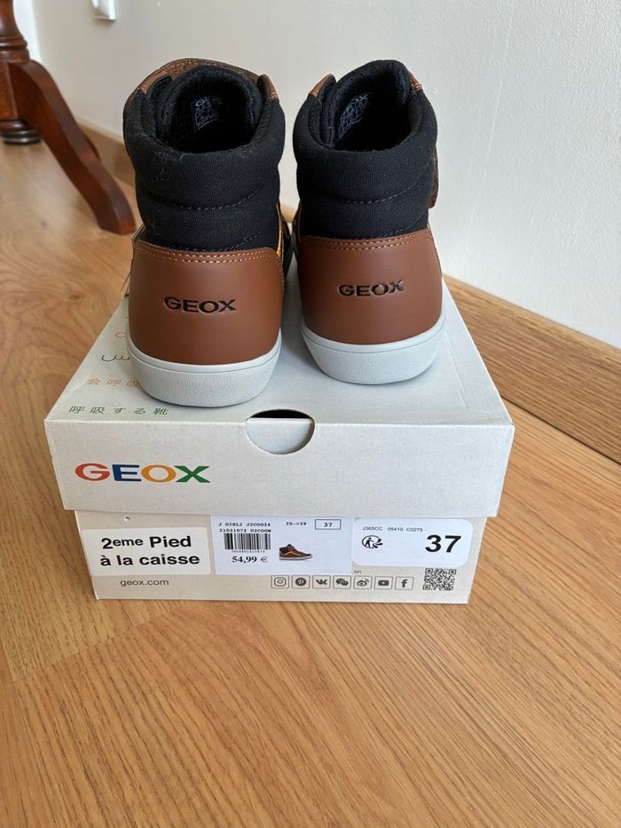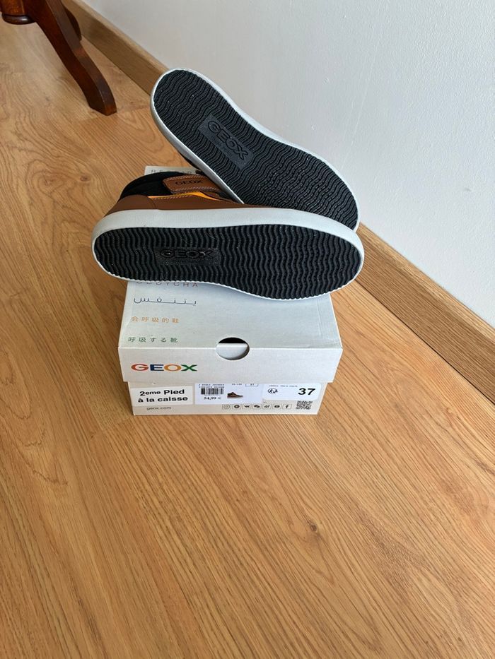 Baskets de la marque Geox totalement neuves encore avec l’étiquette accrochée et dans la boîte d’origine. Baskets à scratch montantes Semelles résistantes Prix achat en magasin : 55€