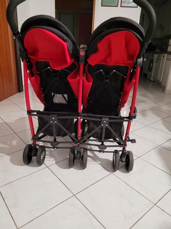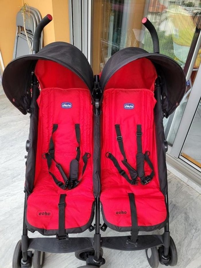 Poussette pour jumeaux, rouge Chicco, en parfait état. Se règle par des manettes, position assise et couchée.