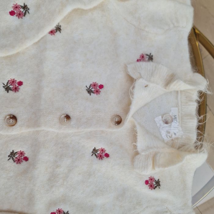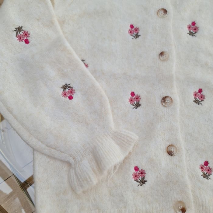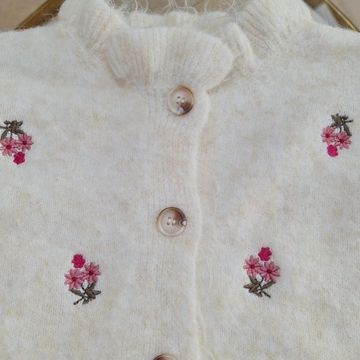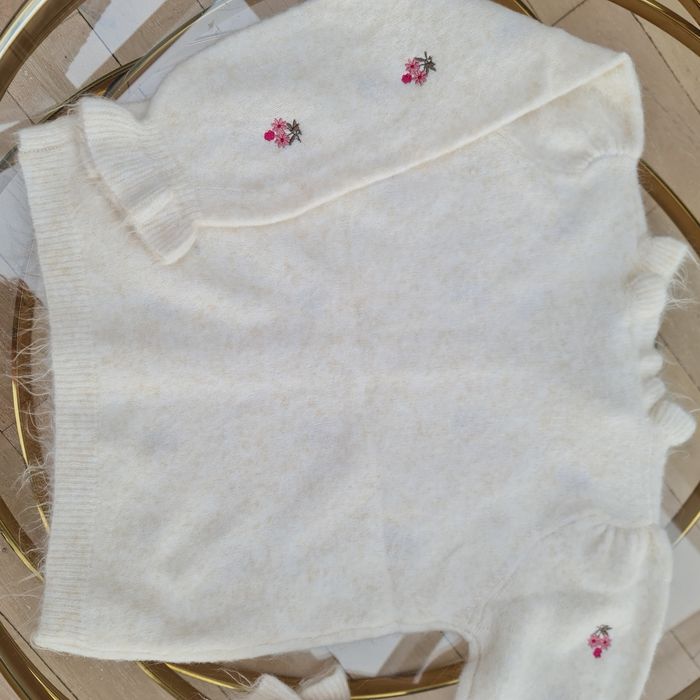 Charmant gilet blanc cassé avec de jolies petites fleurs brodées Son col et ses poignets sont à petits volants Neuf