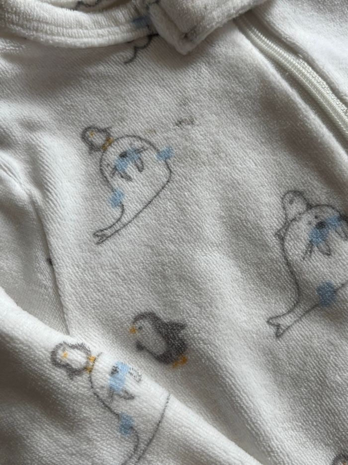 Pyjama en velours à fermeture éclair en taille neuf mois de la marque mode d’enfants il est en bon état, mais il y a une petite tache