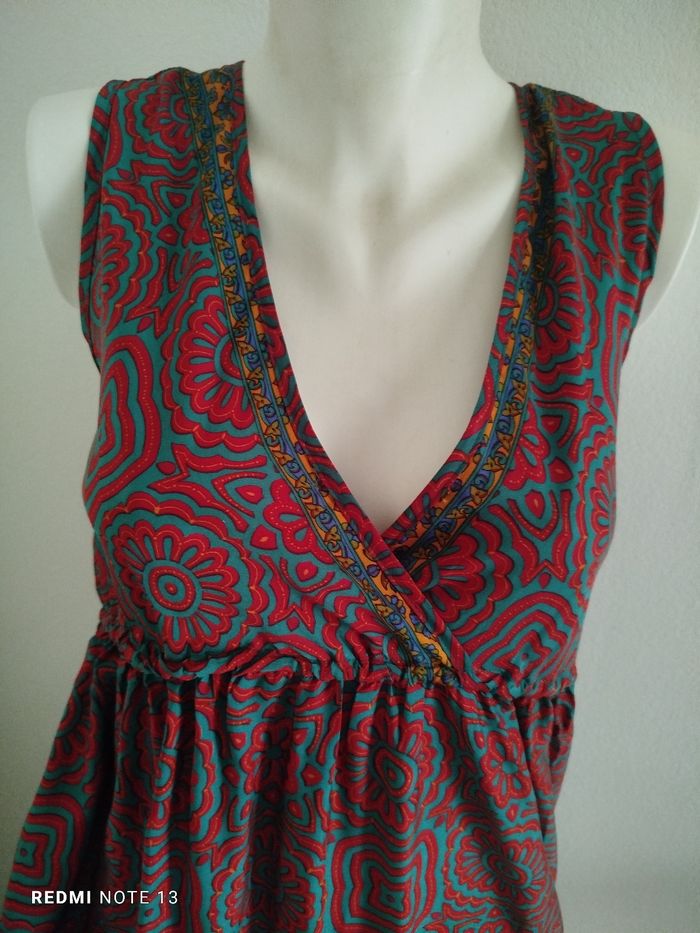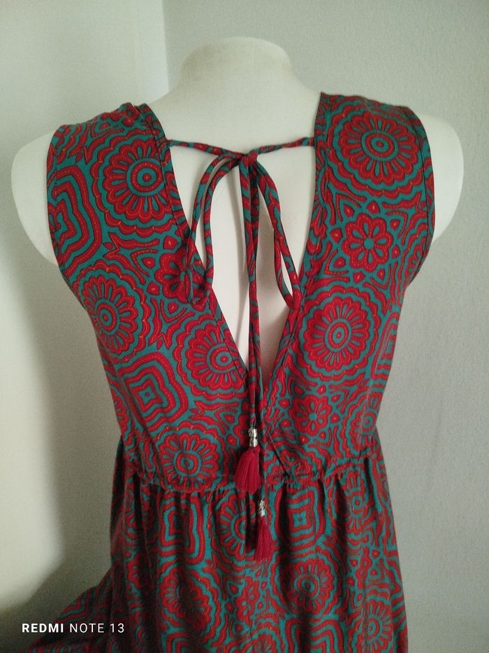 #kytietailleuniquefemme. Robe sans manche taille unique vas de la taille 34 a 40 col V devant et derrière sous poitrine élastique un cordon à laçage dans le dos avec des petits pompons vraiment souple et fluide à moitié viscose et polyester mesure des aisselles 45 cm hauteur de la robe évasée 140 cm de couleur verte et Borderouge avec des petits piquets orange en état neuve ref 720