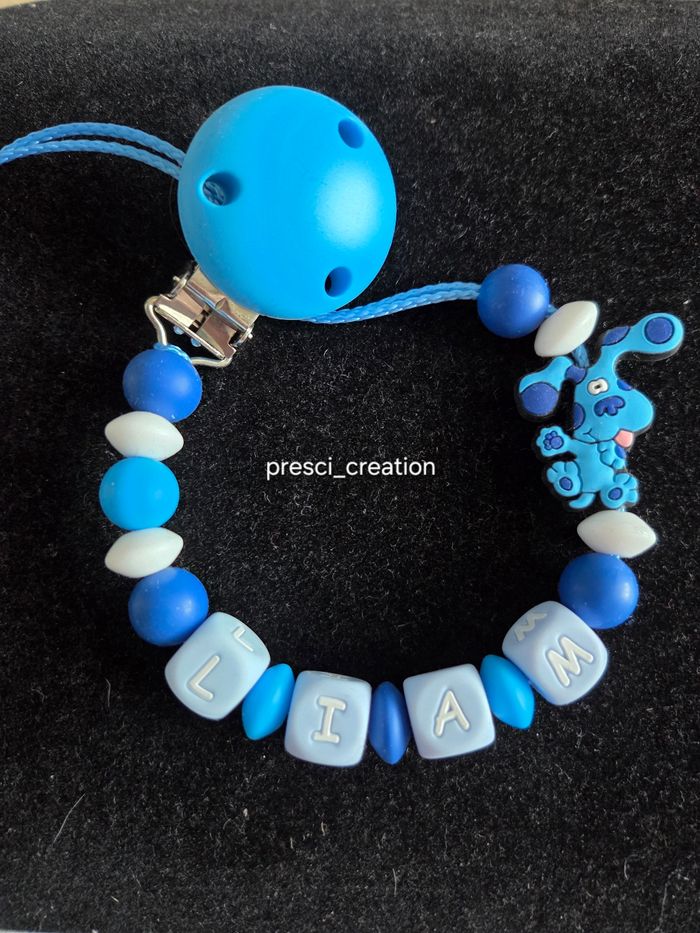 Attache tétine silicone chien bleu 🌟Fil doublé 🌟Nœud de sécurité et nœud anti coulissement 🌟Taille respecter de 22 cm Thème au choix Possibilité de prénom en fluo dans la nuit pour un supplément me contactez Me contactez