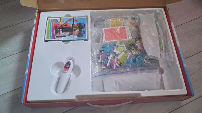 Le super Edukit est une mallette qui propose des jeux autour du dessin animé Miraculous. 3 puzzles de 30, 48 et 60 pièces 6 cubes pour recomposer 6 images amusantes 1 mémo 1 jeu de domino 12 cartes de quiz à résoudre avec un stylo électronique Tout est mis sous plastique et la malette est complète