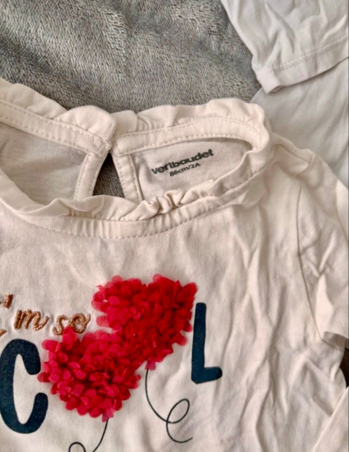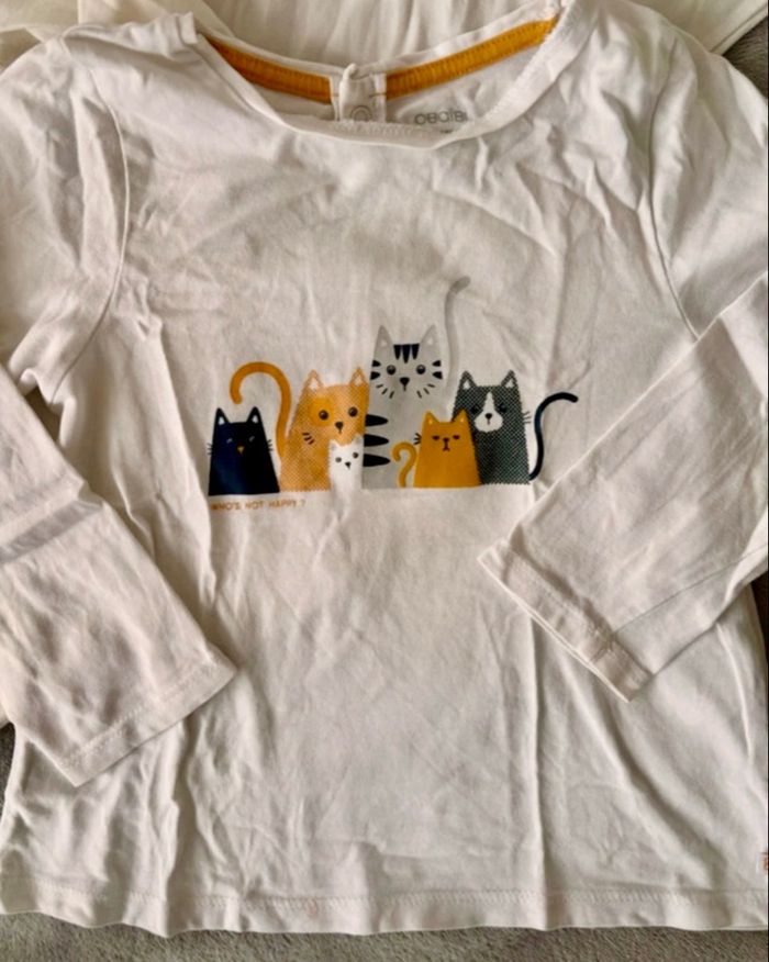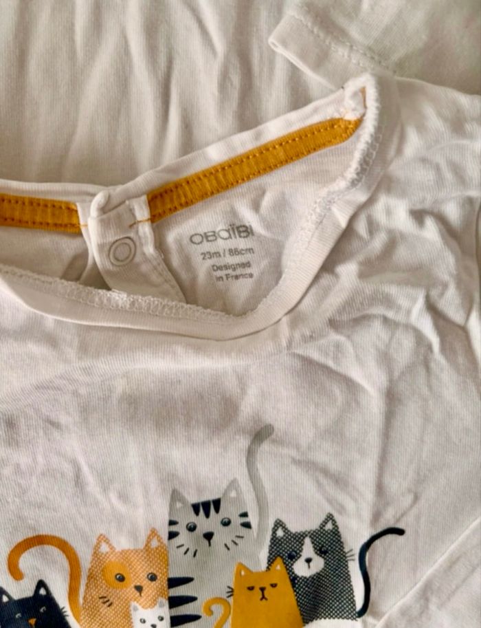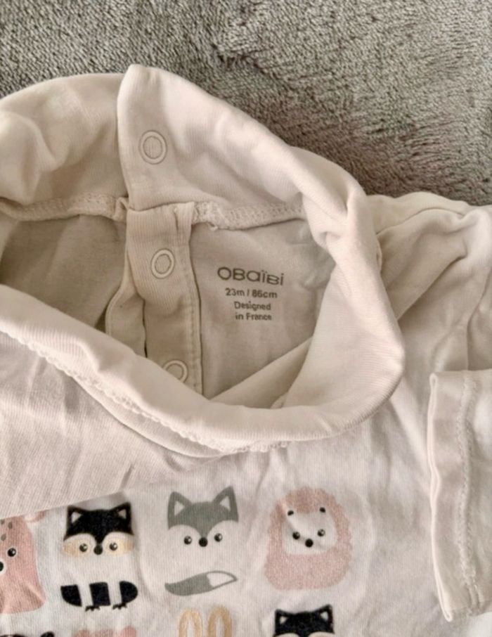 Vends un joli lot de 3 t-shirts à manches longues pour bébé fille, taille 23 mois / 86 cm (convient parfaitement pour du 2 ans). Idéal pour la mi-saison ou sous un pull l'hiver. Détail du lot : • 1 T-shirt blanc cassé (Obaïbi) : Col montant type sous-pull avec pressions au dos. Joli motif animaux de la forêt (renard, faon, hibou, hérisson). • 1 T-shirt blanc (Obaïbi) : Col rond avec pressions au dos. Motif "bande de chats" colorés très mignon. • 1 T-shirt blanc cassé (Vertbaudet) : Col volanté avec ouverture goutte au dos. Motif "I'm so cool" avec deux cœurs rouges en relief (aspect froufrous). État : Très bon état général. Pas de taches ni de trous. Les motifs sont intacts. ‼️Photo et vidéo de l’emballage avant envoi‼️ N’hésitez pas à regarder le dressing ☺️