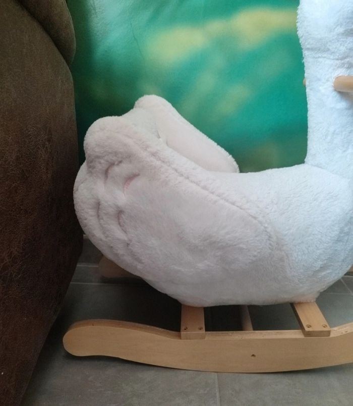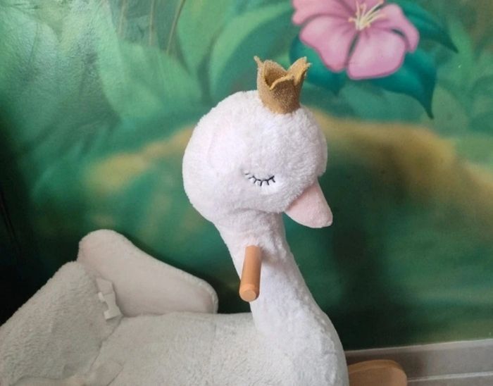 Magnifique bascule enfant en forme de cygne blanc 🦢 Design doux et élégant, parfaite pour une chambre d’enfant. Stable Bois et tissu tout doux Très peu utilisée juste ma fille a arraché la ceinture ( mais vous pouvez la réparé , juste la recoudre mes pas obligé de la mettre) Convient dès le plus jeune âge