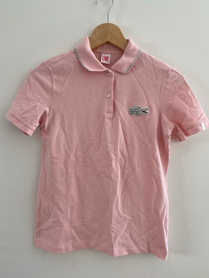 🌸 Polo Lacoste L!VE Rose Pâle - Détails Argentés Magnifique polo Lacoste L!VE authentique en piqué de coton stretch. Un basique revisité avec une touche de brillance, idéal pour un look chic et décontracté. • Couleur : Rose pastel / Rose pâle. • Détails : * Col bordé d'un liseré argenté scintillant. • Crocodile emblématique brodé en fil argenté sur la poitrine. • Petite étiquette effet "peau de croco" blanche sur la manche. • Matière : 94% Coton, 6% Élasthanne (tissu souple et très confortable). • Taille : S (taille normalement). • État : Très bon état général, peu porté. ✨ Parfait avec un jean blanc ou une petite jupe pour le printemps !