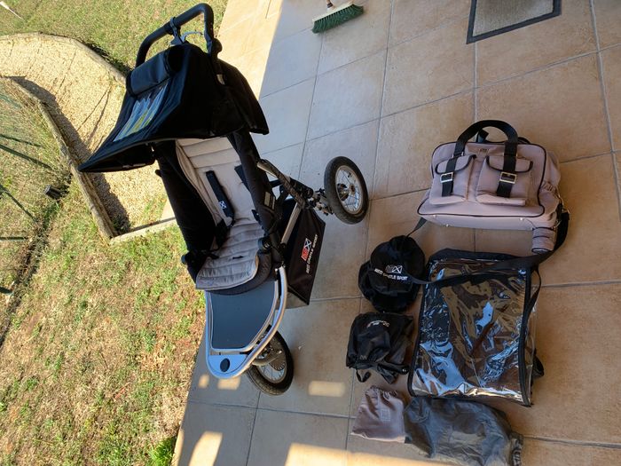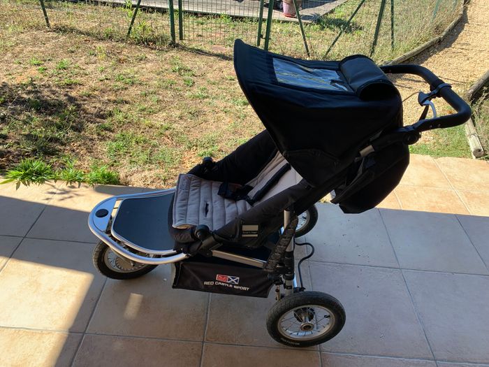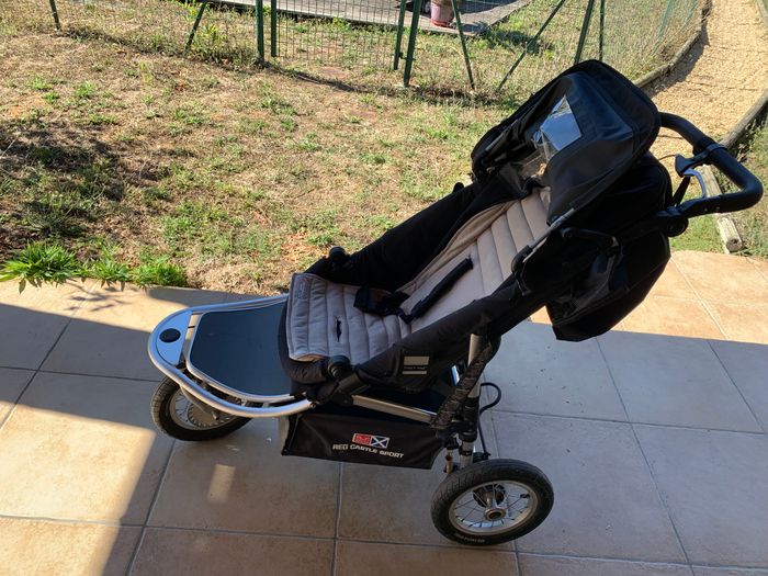 La poussette Shop n’Jogg Disc II de Red Castle est tout-terrain ,sa roue avant pivote à 360°et possède aussi une position fixe pour rouler en ligne. Elle est fabriquée avec des matériaux légers et résistants : l’aluminium pour le châssis et les jantes, et l’acier inoxydable pour les rayons et les moyeux des roues. Son dossier est inclinable sur trois positions, et le large repose-pieds est réglable en hauteur. Le coussin est réversible pour s’adapter aux différentes saisons. Très bon état Peu servi À récupérer sur place