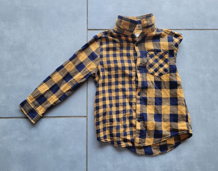 Chemise manches longues, à carreaux, dans les tons marine et moutarde, de la marque Gémo, taille 4 ans, en très bon état. Article lavé pour la vente.