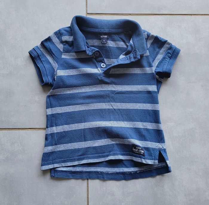 Polo manches courtes, bleu rayé blanc, de la marque Kiabi, taille 4 ans (98-107 cm), en très bon état. Article lavé pour la vente.
