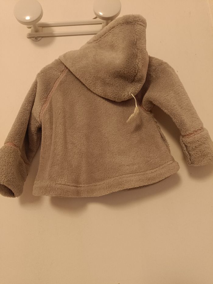 Adorable veste à capuche en matière "doudou" (polaire épaisse et très douce), idéale pour garder bébé bien au chaud. Détails charmants : Petites surpiqûres roses décoratives et boutons nacrés. Pratique : Deux petites poches sur le devant et une capuche pointue avec un petit pompon à l'arrière. Confort : Matière souple qui ne gêne pas les mouvements de l'enfant.