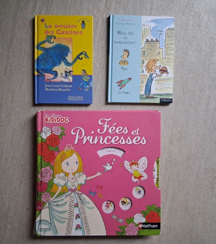 Le journal de Gurty Bertrand Santini ✏️ Vacances chez Tête de Fesses - Tome 5 Très bon état ✏️ Le fantôme de Barbapuces - Tome 7 Très bon état ✏️ La revanche de Tête de Fesses - Tome 9 Très bon état ✏️ Vacances en Angleterre - Tome 10 Très bon état ✏️ Moi j'adore être heureuse - Tome 11 Très bon état Editions Sarbacane Prix éditeur : entre 10.90 € et 12,5 € le titre ✏️ Menu fille ou menu garçon ? Thierry Lenain - Catherine Proteaux Edition Nathan Très bon état ✏️ La sorcière des cantines Jean-Loup Craipeau Mathieu Blanchin Père Castor Edition Flammarion Très bon état Livre offert pour l’achat de cette annonce ✏️ Fées et Princesses Livre pop up La couverture et la première page sont abîmées mais cela reste un livre très sympa à feuilleter Edition Nathan Les albums Kikidoc Bien qu’en très bon état, il s’agit de livres d’occasion qui peuvent présenter des traces sur la couverture ou les coins. N’hésitez pas si vous souhaitez des photos supplémentaires. Livraison acceptée Ou remise en main propre possible sur Paris, La Défense, Bibliothèque François Mitterrand, Gare de Lyon, Etampes