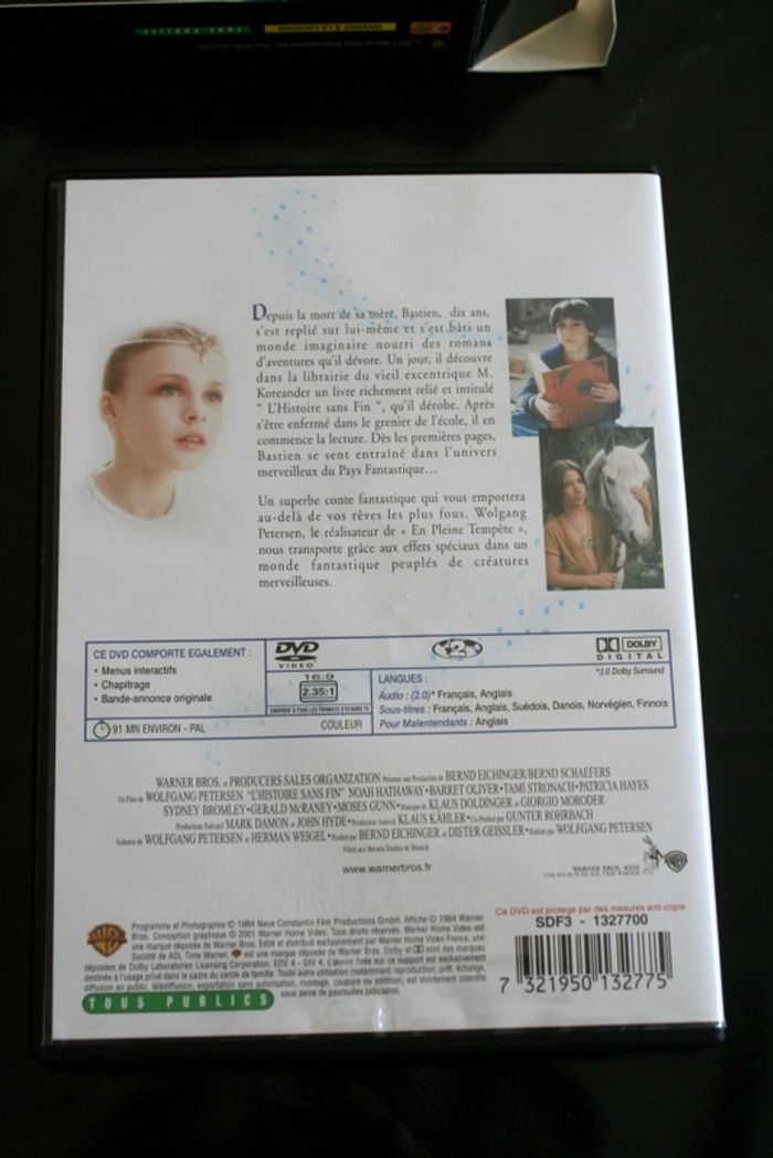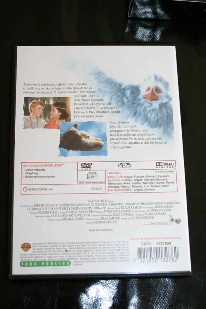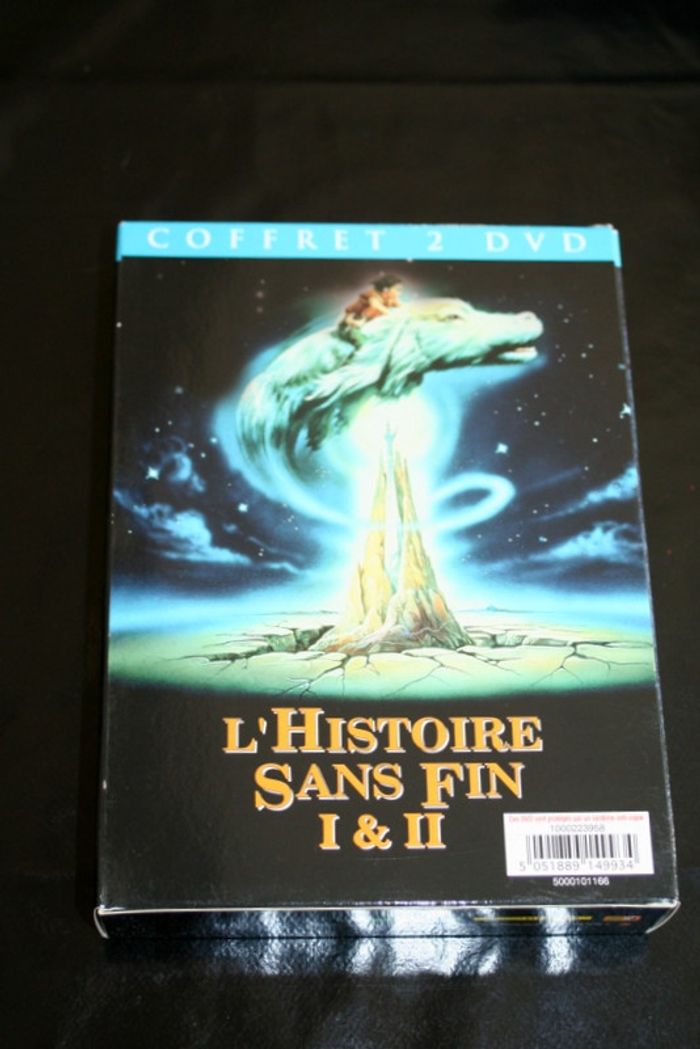 Coffret 2 DVD L'histoire sans fin I & II, pour le 1 de Wolfgang Petersen avec Barret Oliver, Noah Hathaway, Tami Stronach, pour le 2 de George Miller avec Jonathan Brandis, Kenny Morrison, Clarissa Burt, les dvd passent parfaitement car visionnés avant la mise en vente, 120g Bastien, dix ans, est un passionné de romans d'aventures. Un jour, il dérobe un ouvrage merveilleux peuplé d'extraordinaires créatures. Il s'enfonce fébrilement dans l'univers fantastique de ce livre qui le fascine.