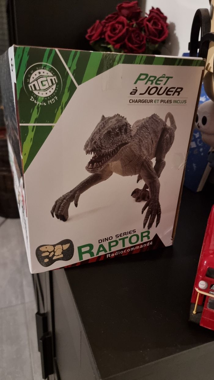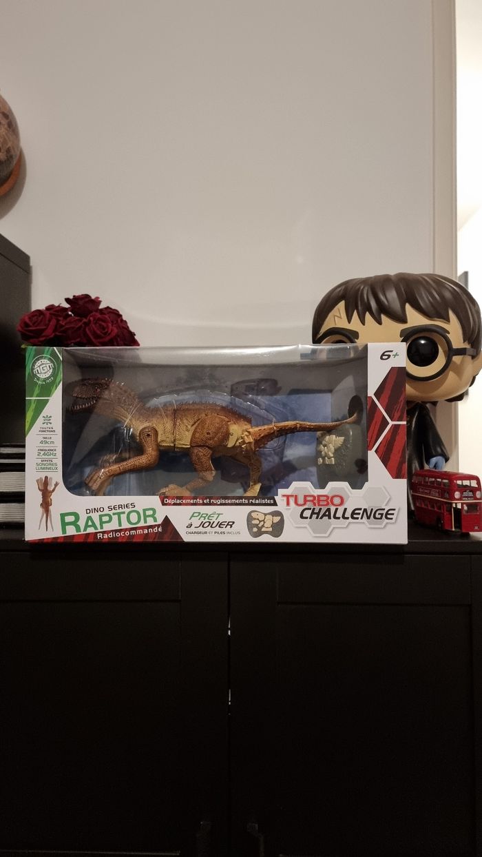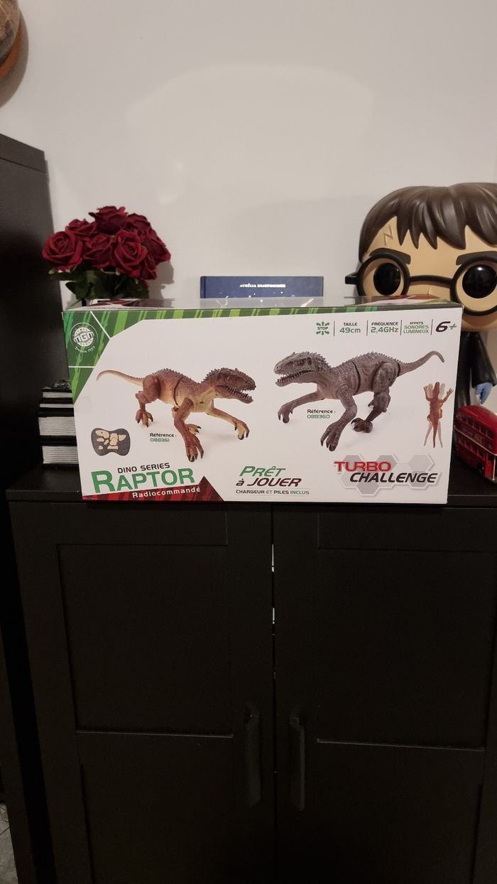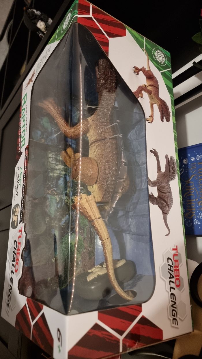 A vendre un jouet sympathique pour amuser votre enfant un dino raptor radiocommande déplacement et rugissement réaliste. Article de chez turbo challenge, dinosaure neuf jamais utilisé taille 49 cm. Valeur magasin 50€