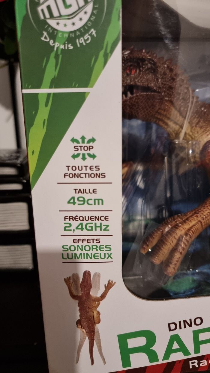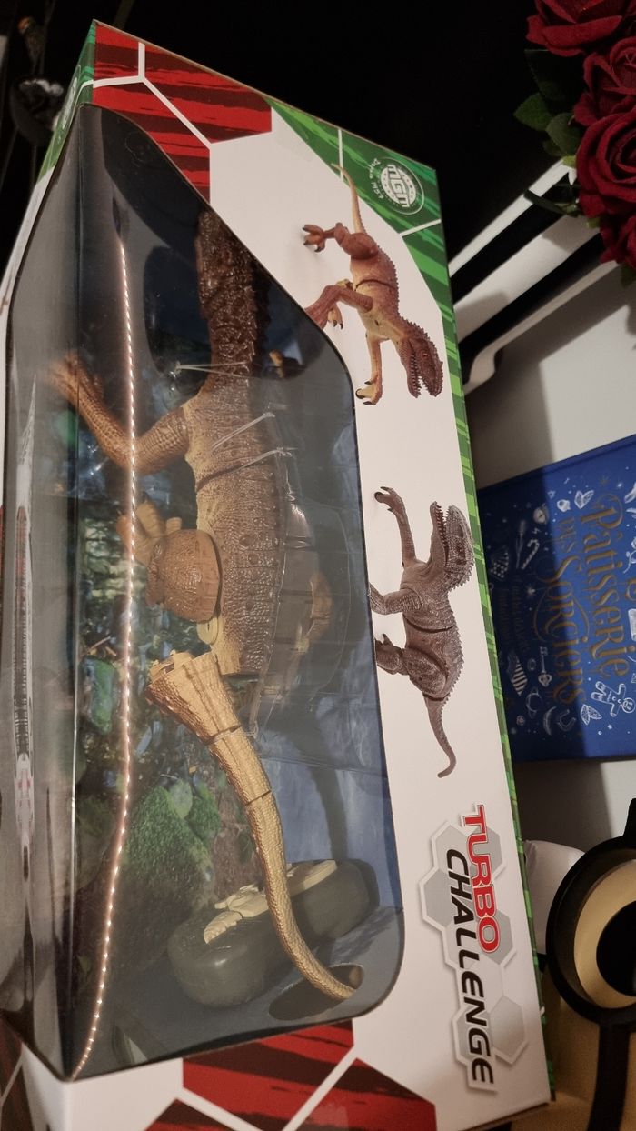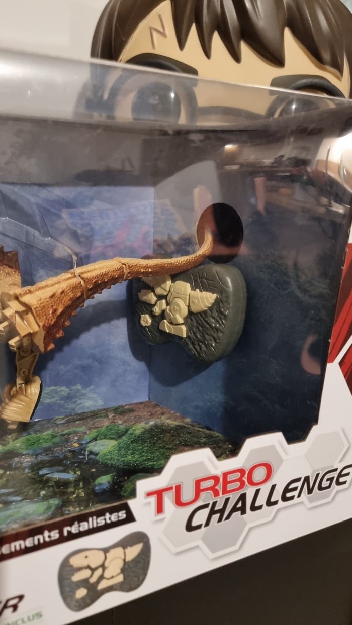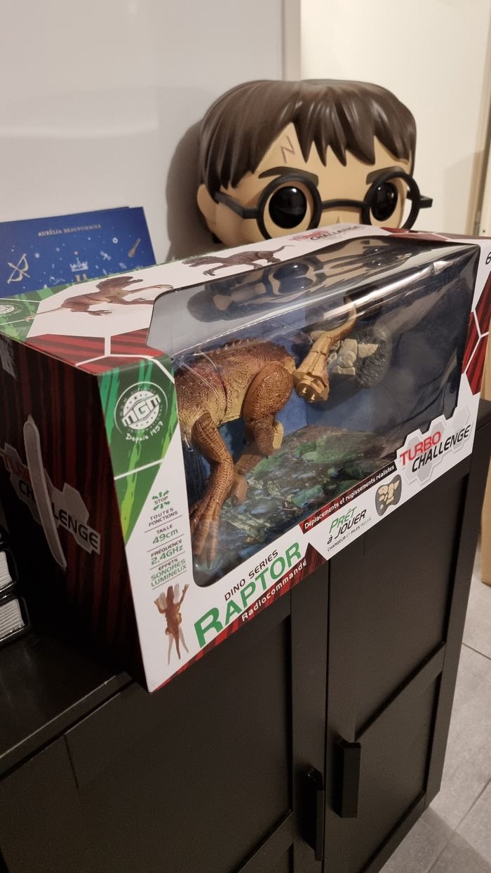 A vendre un jouet sympathique pour amuser votre enfant un dino raptor radiocommande déplacement et rugissement réaliste. Article de chez turbo challenge, dinosaure neuf jamais utilisé taille 49 cm. Valeur magasin 50€
