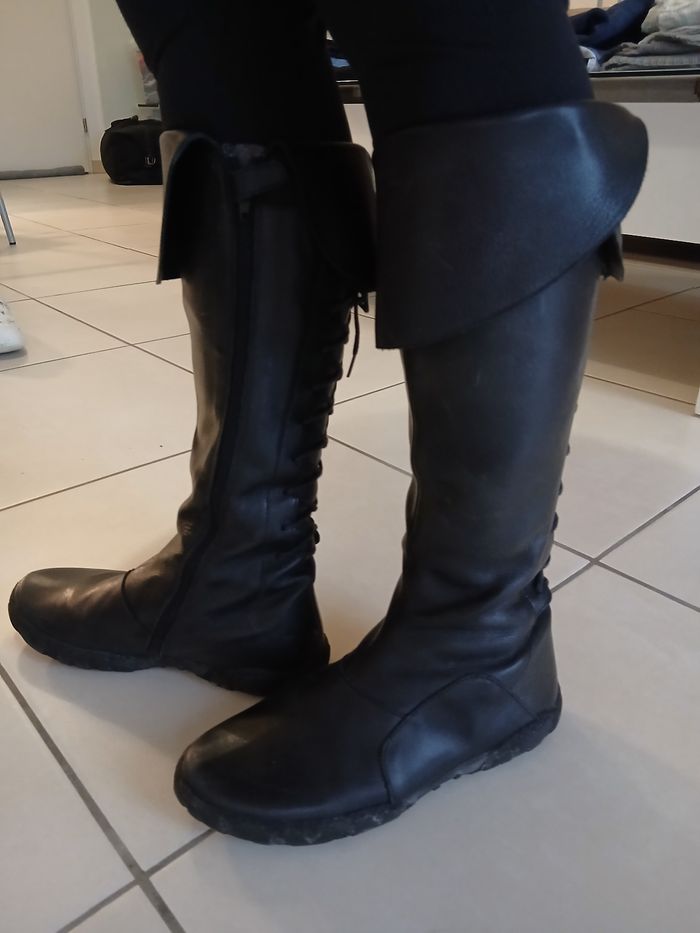 Bottes tout cuir extérieur et doublure cuir, semelles en gomme non usées, zippées sur le côté avec long lacet derrière, en très bon état